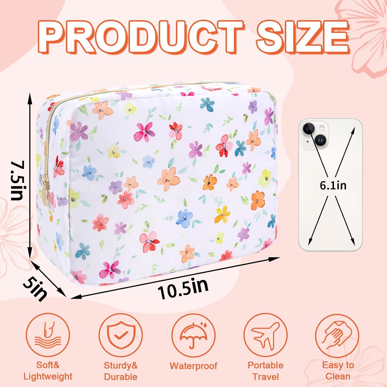 Waterproof Large Floral Makeup Pouch,Nylon Travel Toiletry Storage Purse Preppy Cosmetic Bag for Women Girl,Large Capacity Makeup Organizer Zipper Pouch for Work(L Colorful-Flowers)