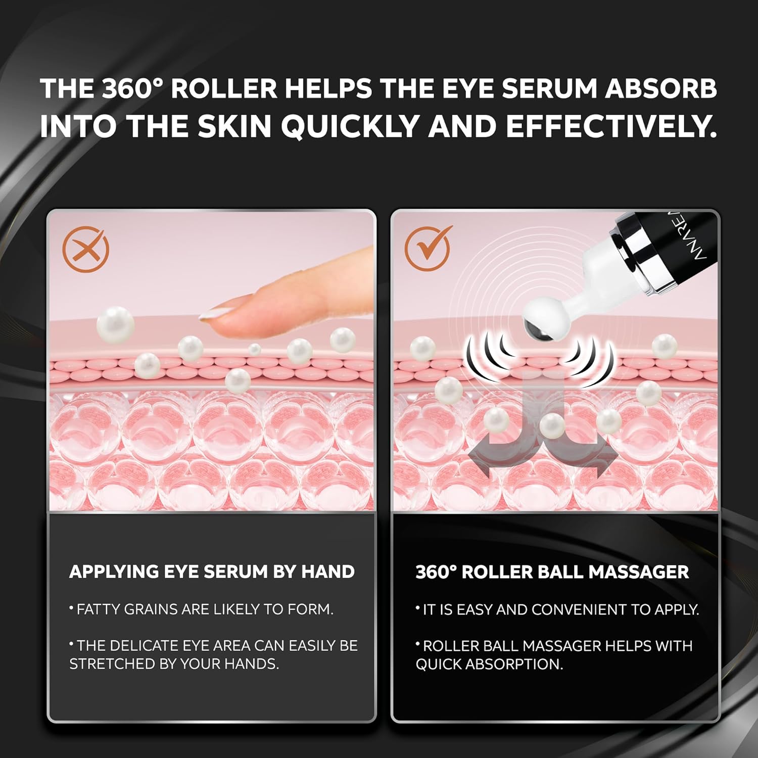 - EASY AND USER-FRIENDLY: Our Eye Cream for Wrinkles comes with a distinctive 360Β° cooling stainless steel roller-ball for application. This tool is especially effective when paired with our Dark Eyes Circle Treatment. The Eye Roller for Eye Wrinkle Cream for Women & Men ensures an even spread of the serum around the eyes while also offering a thorough massage for the eye contour.