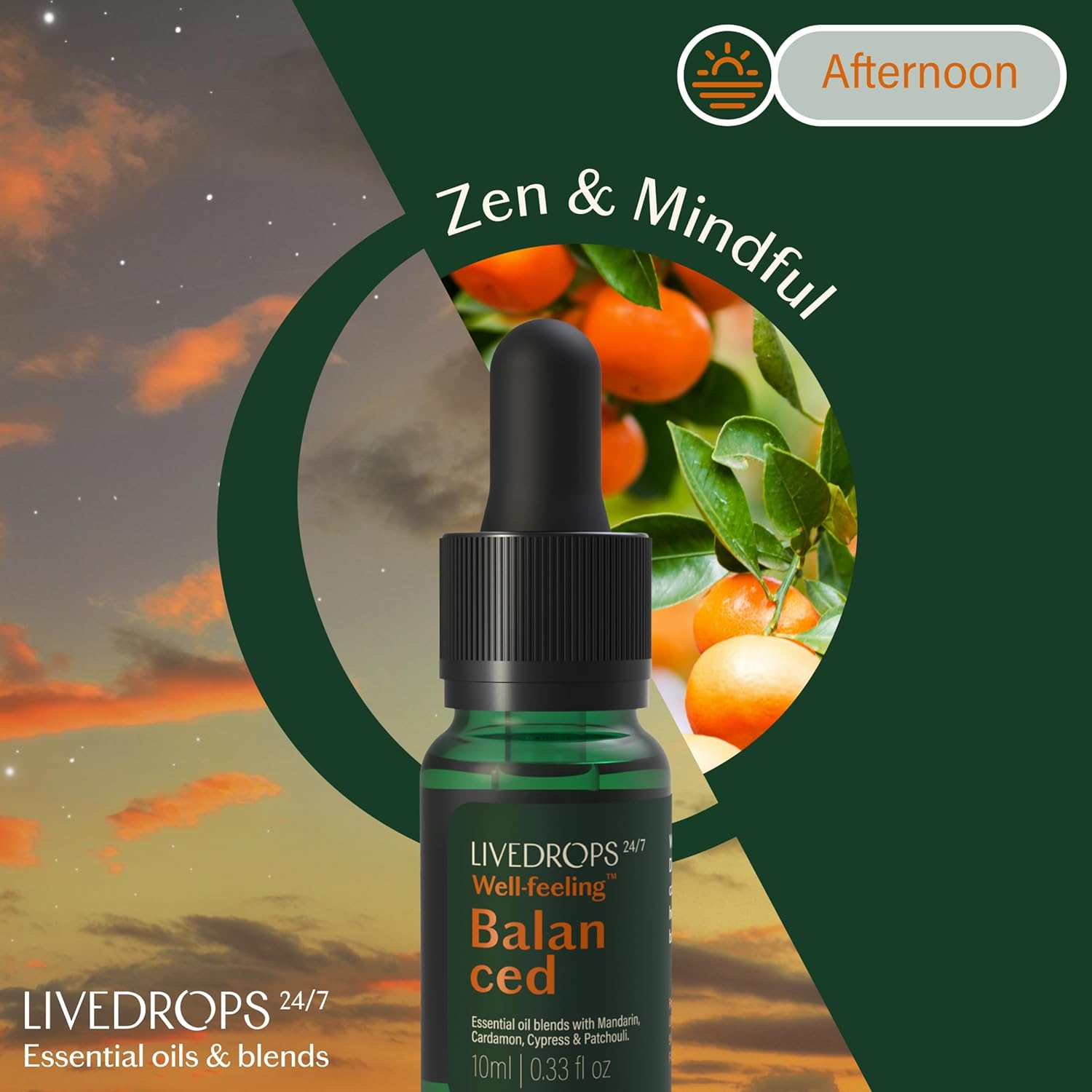 LIVEDROPS 24/7 Balanced Essential Oil Blend Mandarin Cardamom Cypress Patchouli | Aromatherapy for Calm, Harmony & Grounding | Skin-Safe Diffuser Oil | Vegan French Perfumers Clinically Tested 10ml