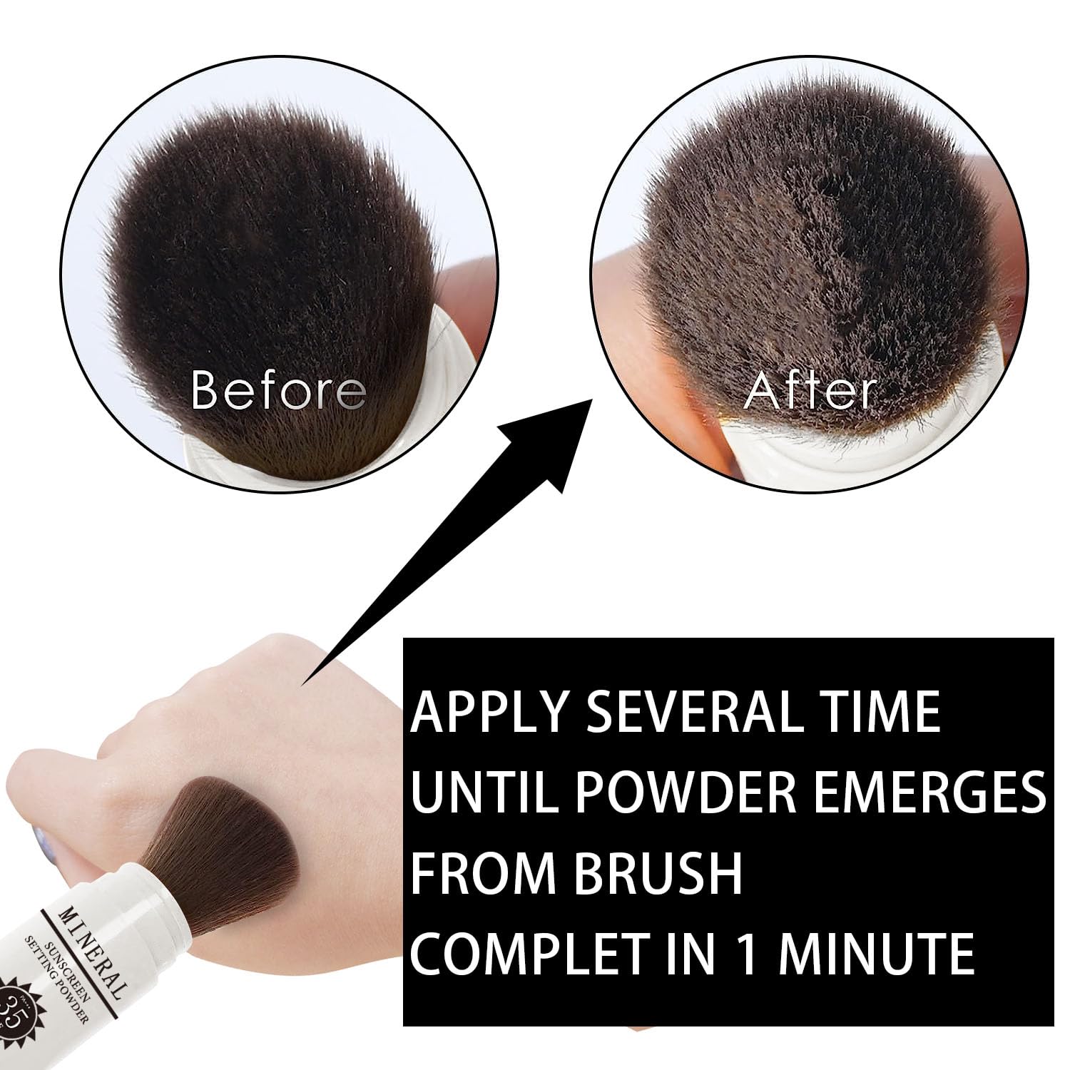 - Brush Design - The high-density quality brushes dispense a precise amount of setting powder. After applying makeup, take off the cap, slide down the brush sleeve, brush required setting powder on your face, pull up the plastic sleeve and cover the cap after finished.