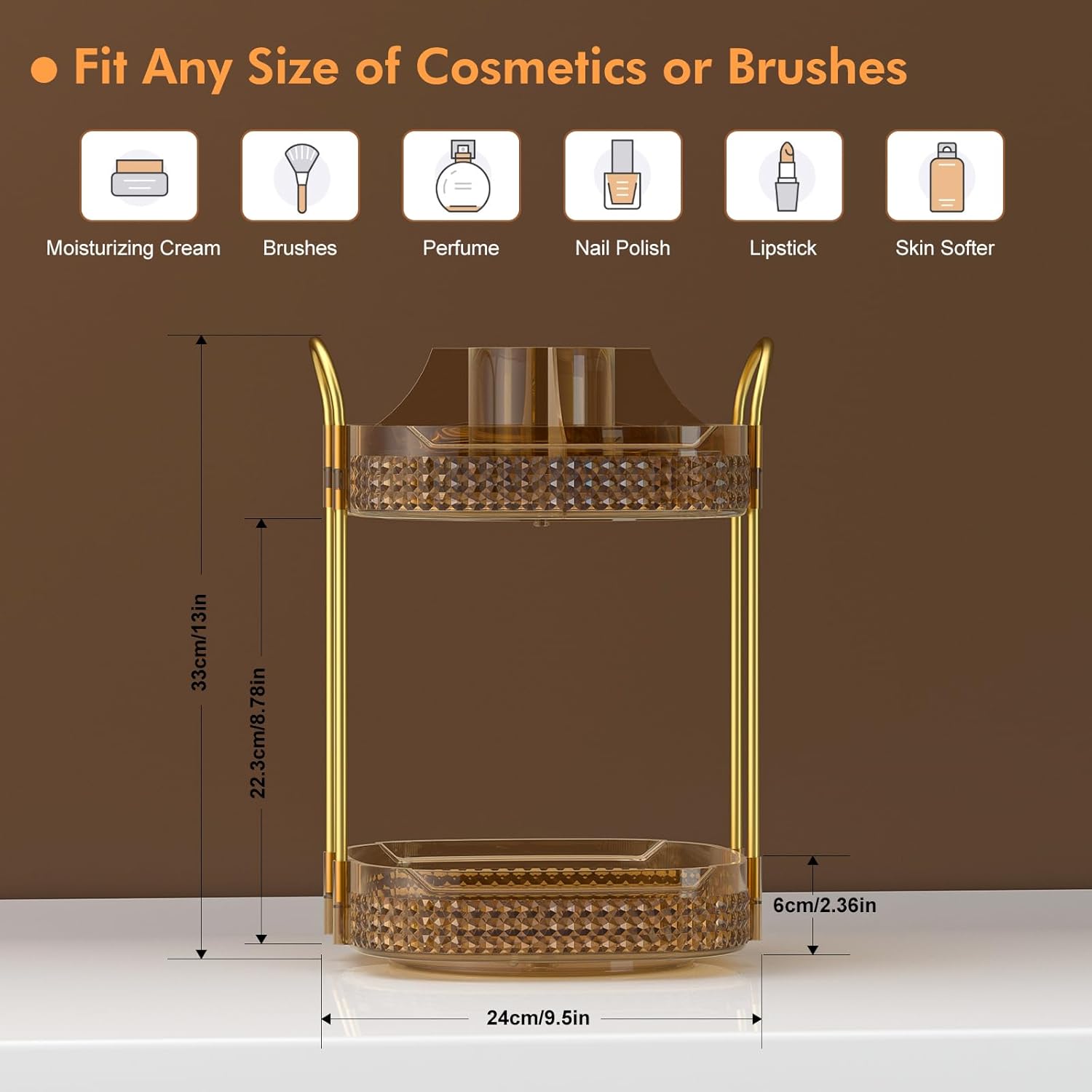 Awenia Rotating Makeup Organizer 360, Stackable Adjustable Large Capacity Cosmetic Storage Unit,Dresser Bathroom Kitchen Countertop Organizer with Metal Handle, Plus Size (Honorable Gold, 2 Tier)