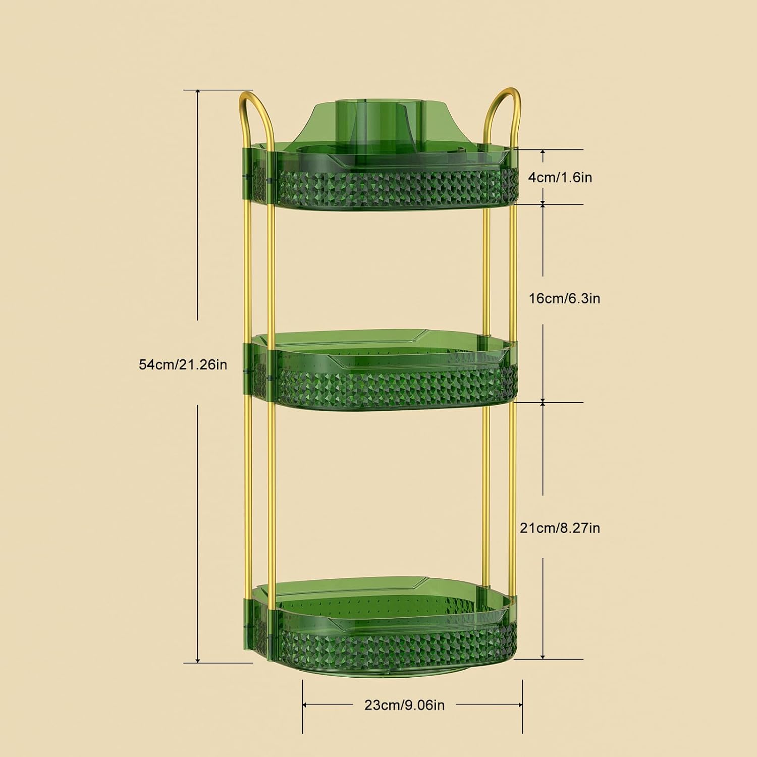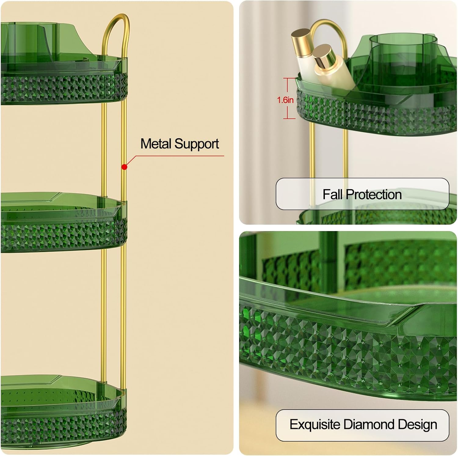 - Premium Quality Materials: The cosmetics organizer is composed of high-quality acrylic trays and sturdy metal brackets, which are stable enough. The edge details of the tray have been raised to prevent items from falling off during rotation