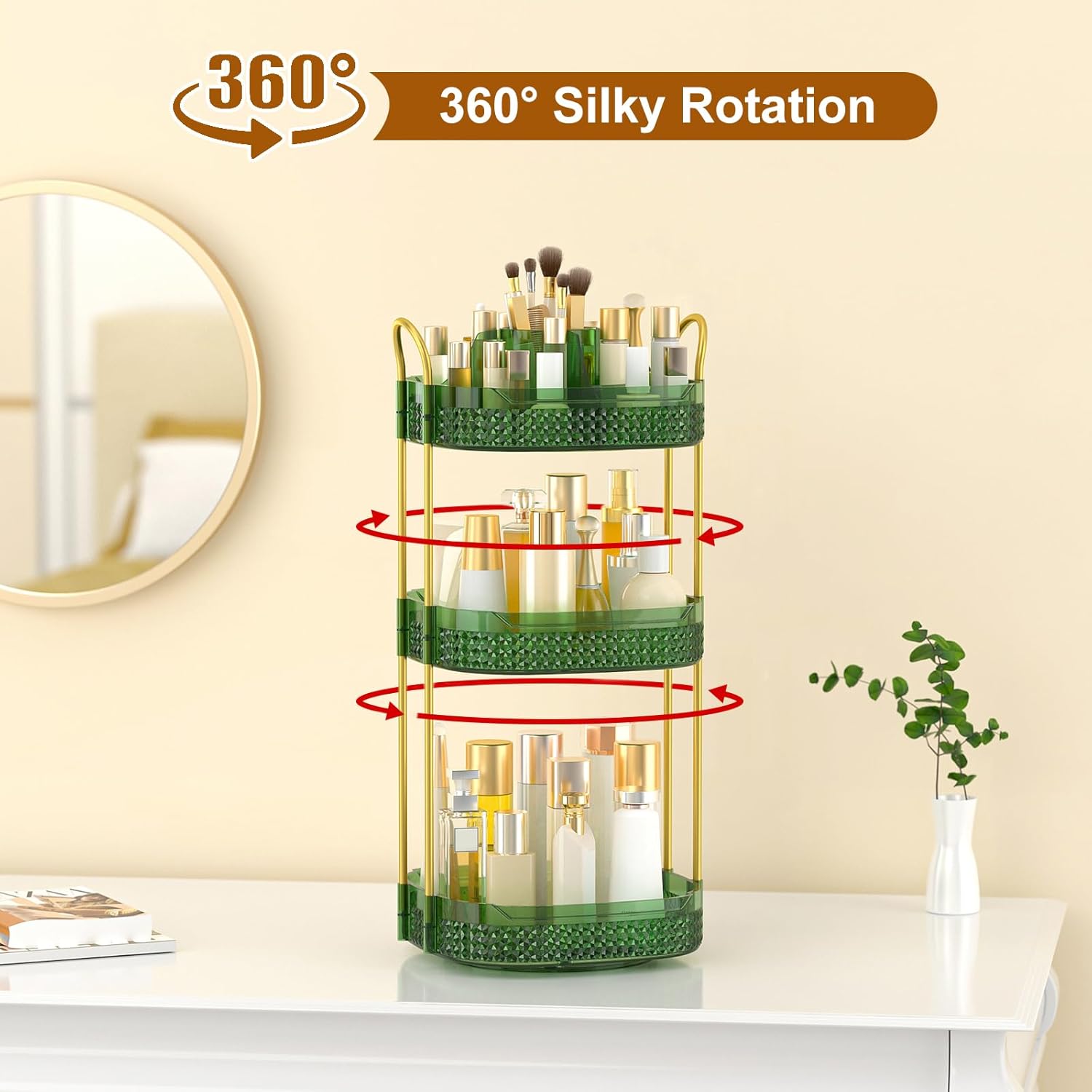 - Spinning Organizer: Truly find items in a second with the 360 rotating makeup organizer, all you have to do is turn it around and the items on the inside are easily accessible. Gentle and stable turntable, no need to worry about the cosmetics being knocked over while spinning