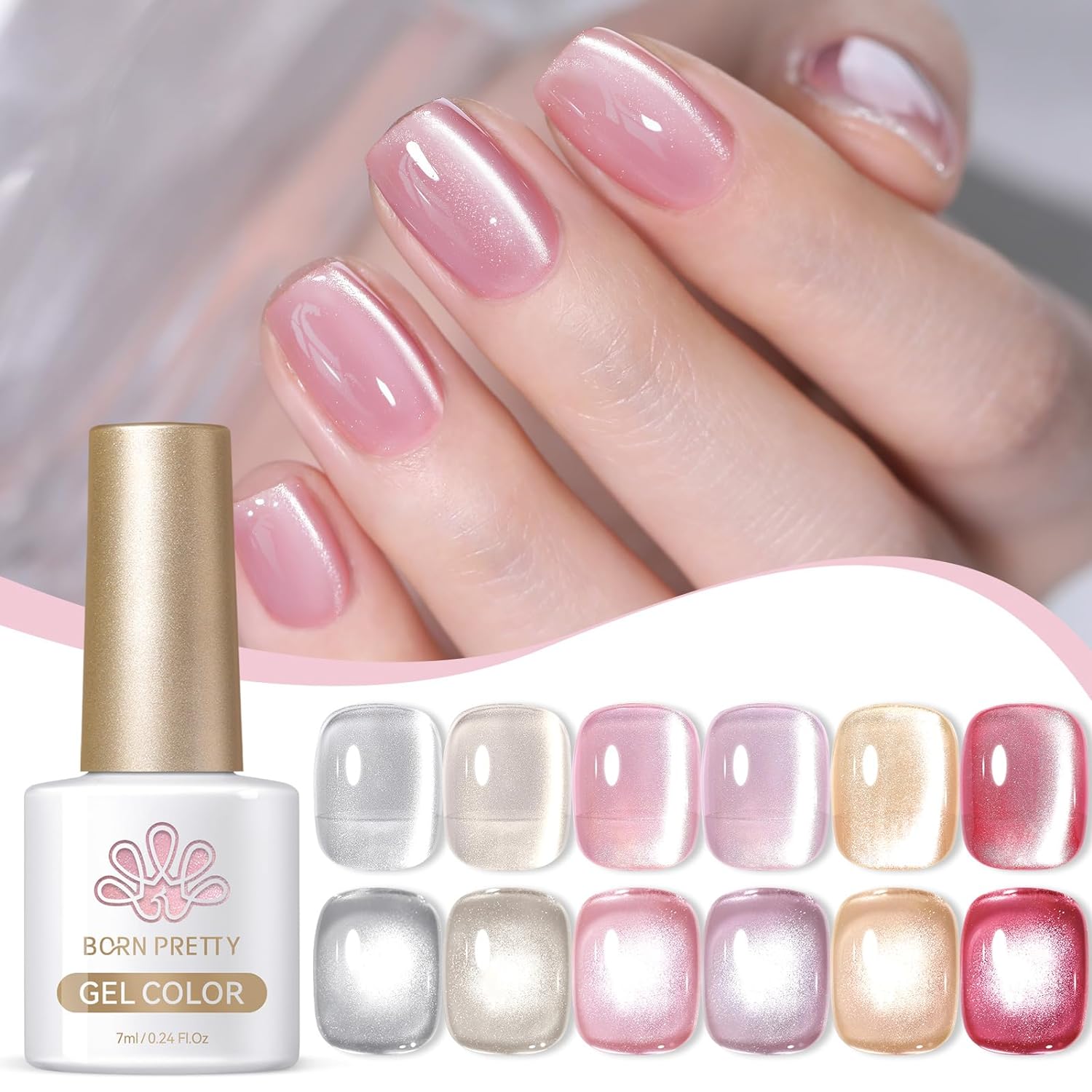 Born Pretty Magnetic Gel Nail Polish Water Light Cat Magnetic Eye Jelly Pink Glass Crystal Gel Polish Glitter Shimmer Auroras Nail Polish LED Nail Art Manicure Kit 6PCS