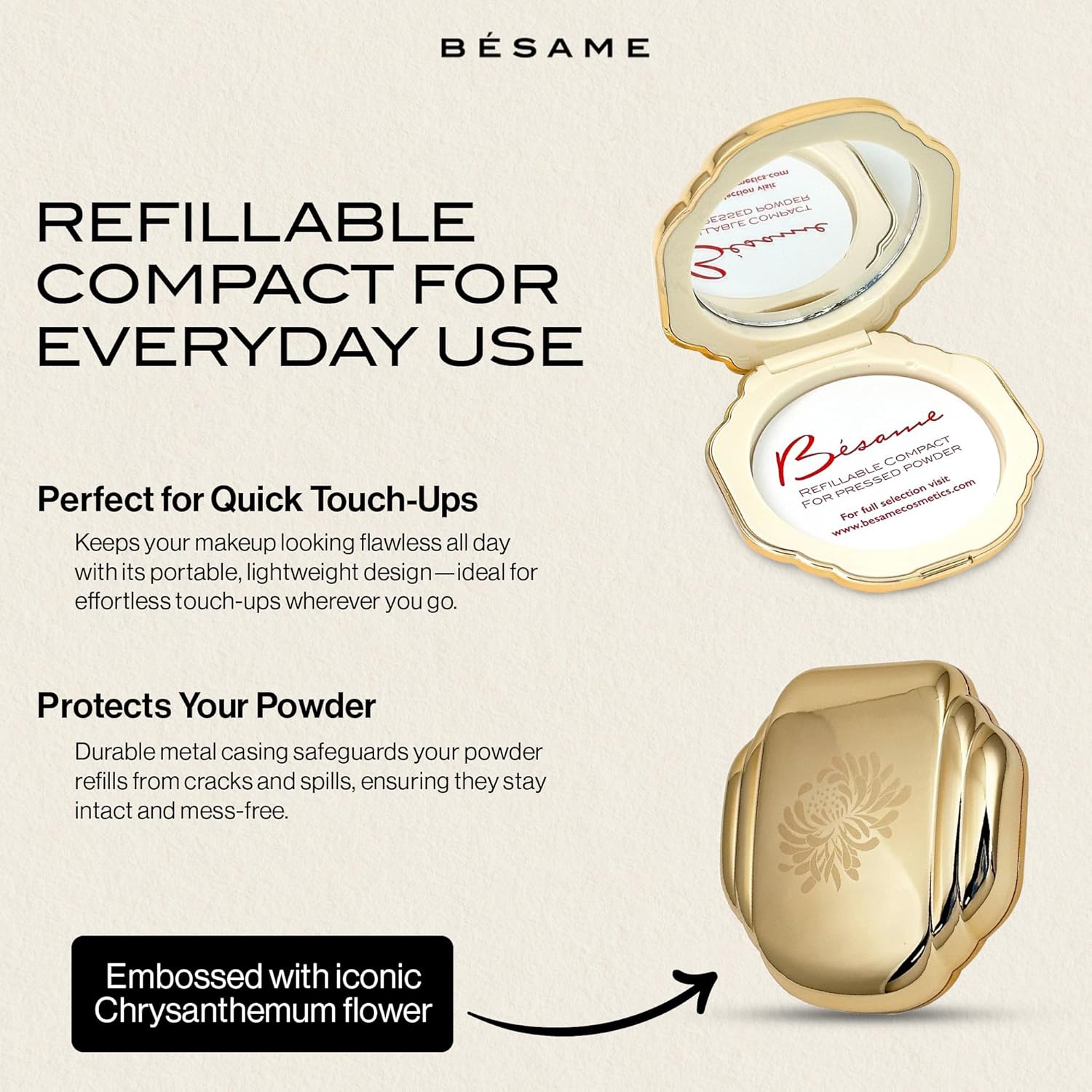 - NO POWDER INCLUDED: This refillable compact case has no powder inside; pair it with Besame powder refills, designed for setting makeup, highlighting & adding color