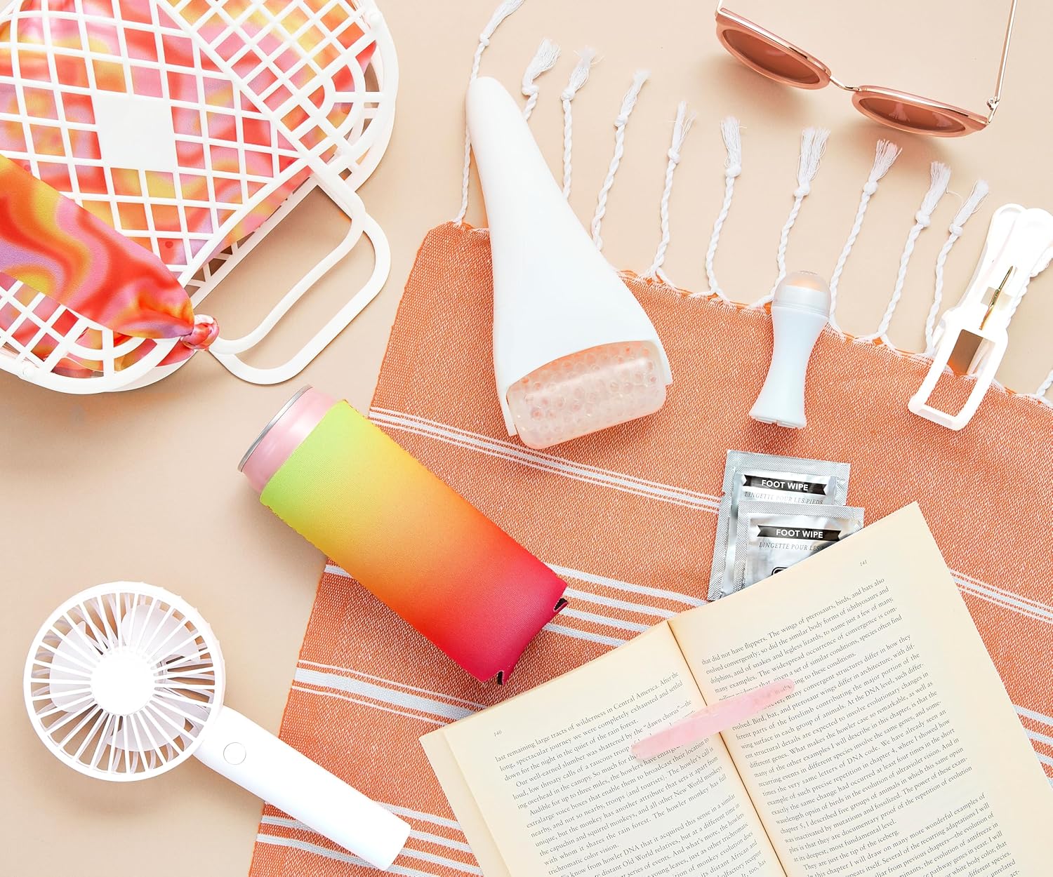 - BEACH & VACATION ESSENTIALS β Our 10 essentials & accessories will be sure to leave you feeling chic, trendy and cool. Every item was hand-picked for your convenience! It includes 2 towel clips, thumb-page holder for reading, floatie repair patches, 2 foot wipes, a mini rechargeable fan, oil-absorbing roller, ice roller, a slim can cooler & a scrunchie
