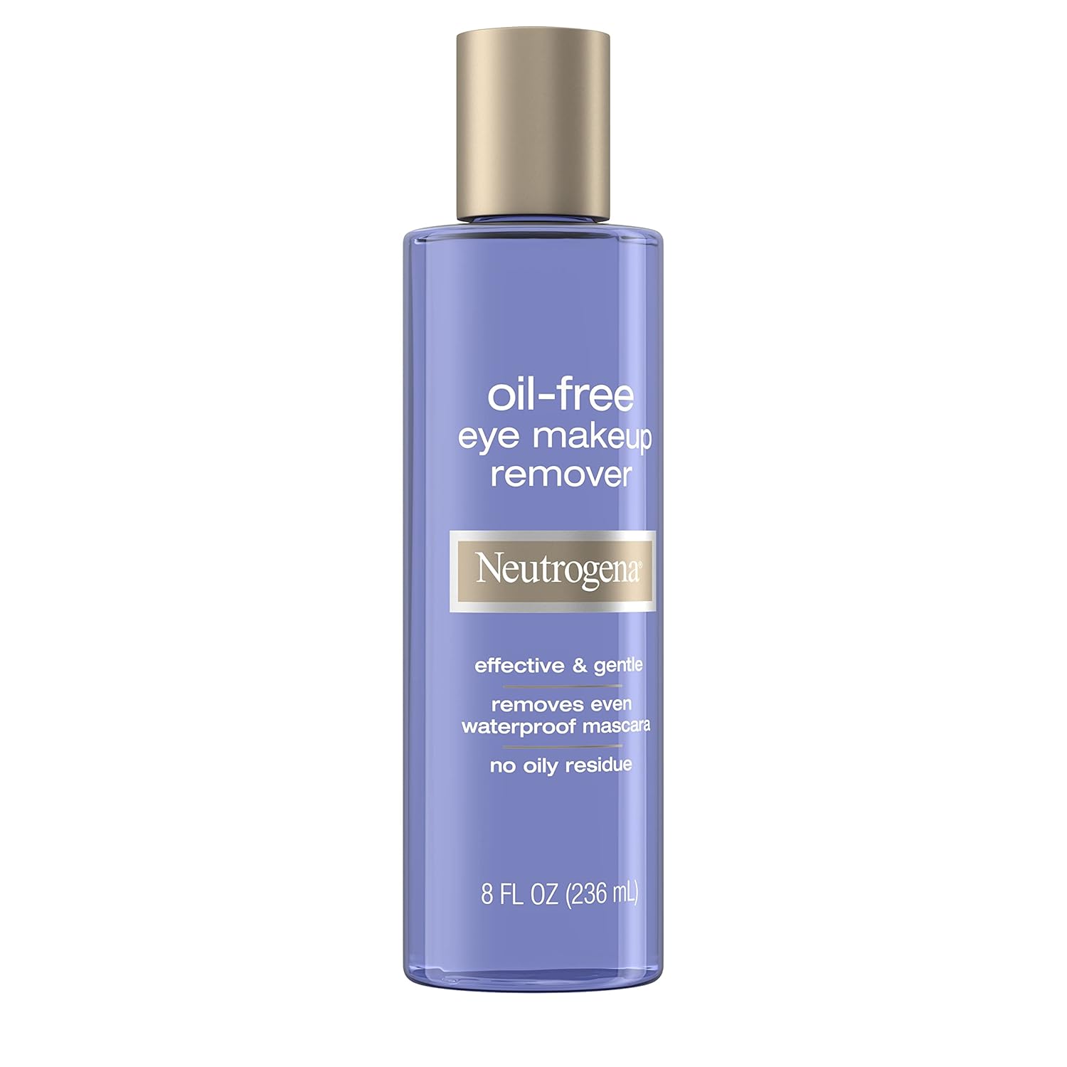 - Neutrogena bottle of dual-phase 100% oil-free liquid eye makeup remover and makeup cleanser formulated with soothing aloe and cucumber for sensitive eyes