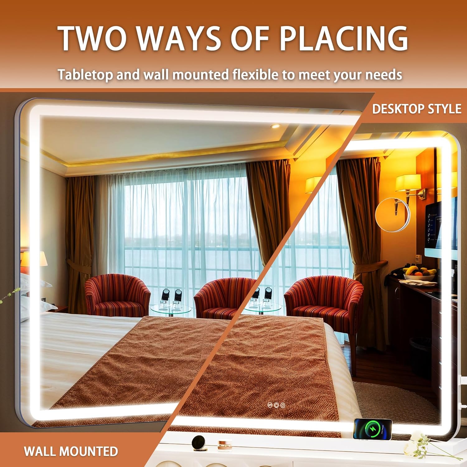 - 👍【Detachable Mirror Base & Hanging setting】Wall mounted or Table Top design meet your different needs.This large makeup mirror designed with detachable base and two back hole for nail. 1.Removing mirror base with a screwdriver. 2.Knocking two nails on the wall. 3.Hanging mirror on the wall.