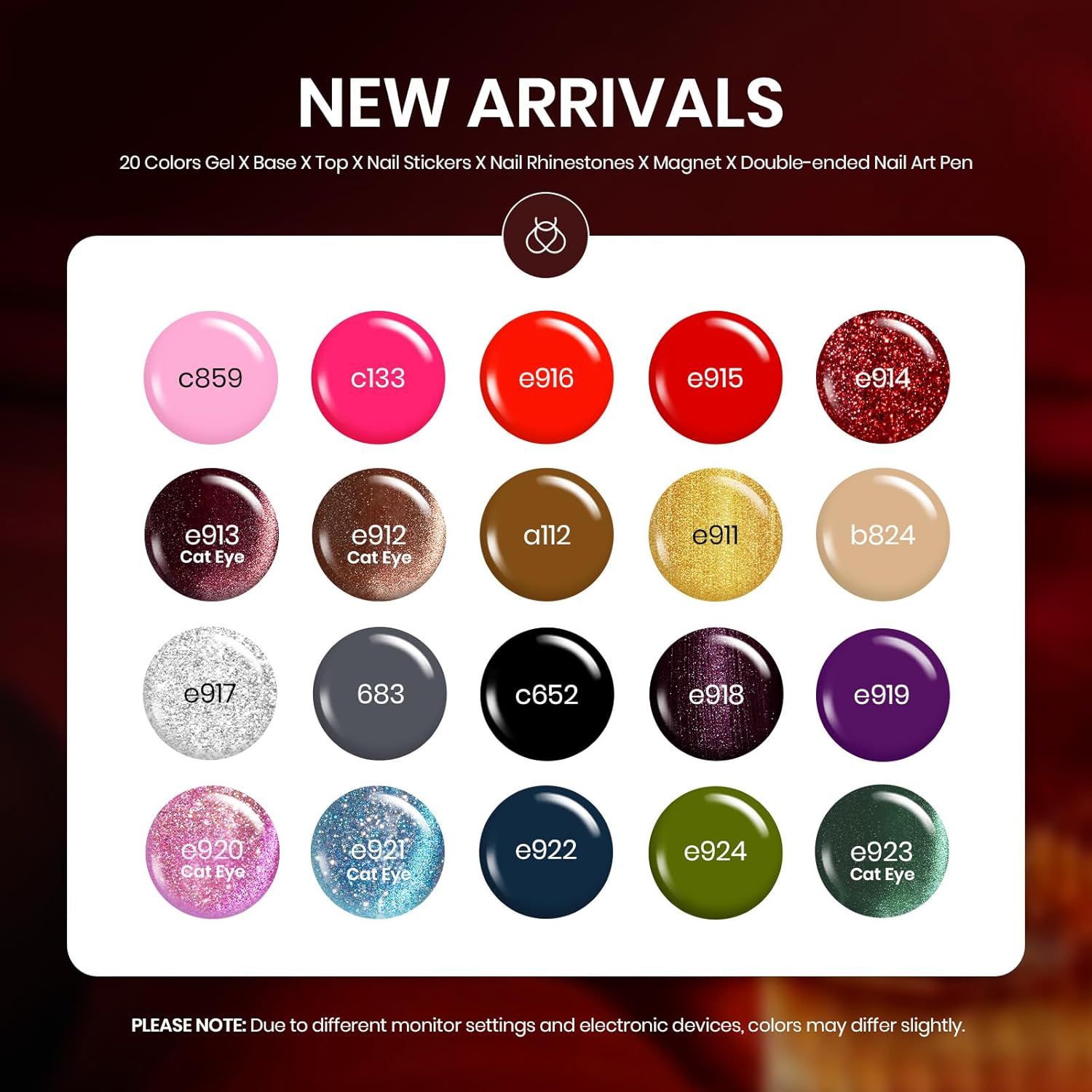 - Included Components : Gel nail polish (20 bottles), base coat, glossy top coat, matte top coat, double-ended nail art pen, double-ended magnet, leopard nail sticker, rainbow rhinestone, instruction manual, gel polish organizer Gel nail polish (20 bottles), base coat, glossy top coat, matte top coat, double-ended nail art pen, double-ended magnet, leopard nail sticker, rainbow rhinestone, instruction manual, gel polish organizer