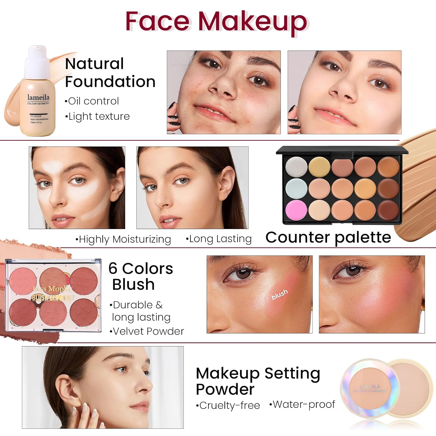 - 【Makeup Kit for Women Full Kit】This makeup kit for women includes 2 14-color matte & shimmer eyeshadow palette, 1 liquid eyeshadow, 1 liquid foundation, 1 15-color concealer palette, 1 6-color blush palette, 1 makeup setting powder, 6 lip gloss, 1 eyebrow pencil, 1 waterproof mascara, 1 eyeliner pencil, 1 liquid eyeliner, 8 makeup brushes, 1 makeup sponge and 1 rainbow color cosmetic bag. This comprehensive set covers the majority of your daily facial makeup essentials.