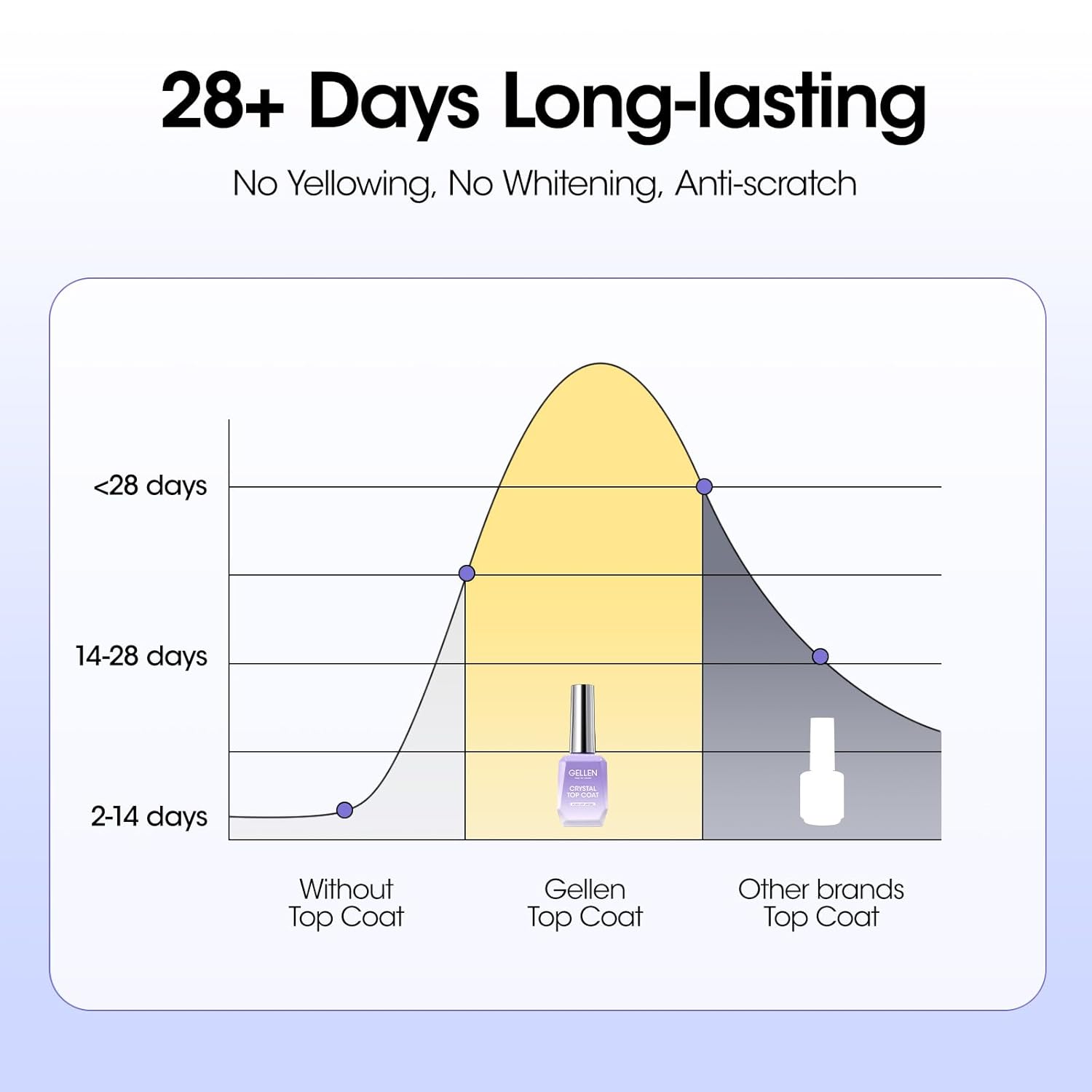 - 【Enhanced Anti-scratch Enhanced Crystal Gel Top Coat】: Formulated with active polymers featuring a dense molecular structure, this 18ml Gellen top coat offers water resistance, robustness, and anti-scratch properties. The protective layer effectively enhances nail hardness and abrasion resistance, ensuring worry-free protection against scratches.