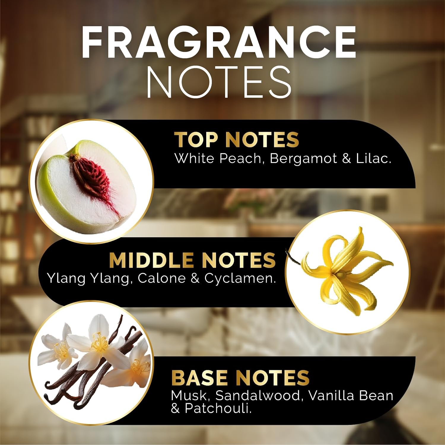 - Key Notes: White Peach | Lilac | Sandalwood. Indulge in the delicate sweetness of White Peach, Intertwined with the soft floral notes of Lilac, and grounded by the warm, woody essence of Sandalwood.