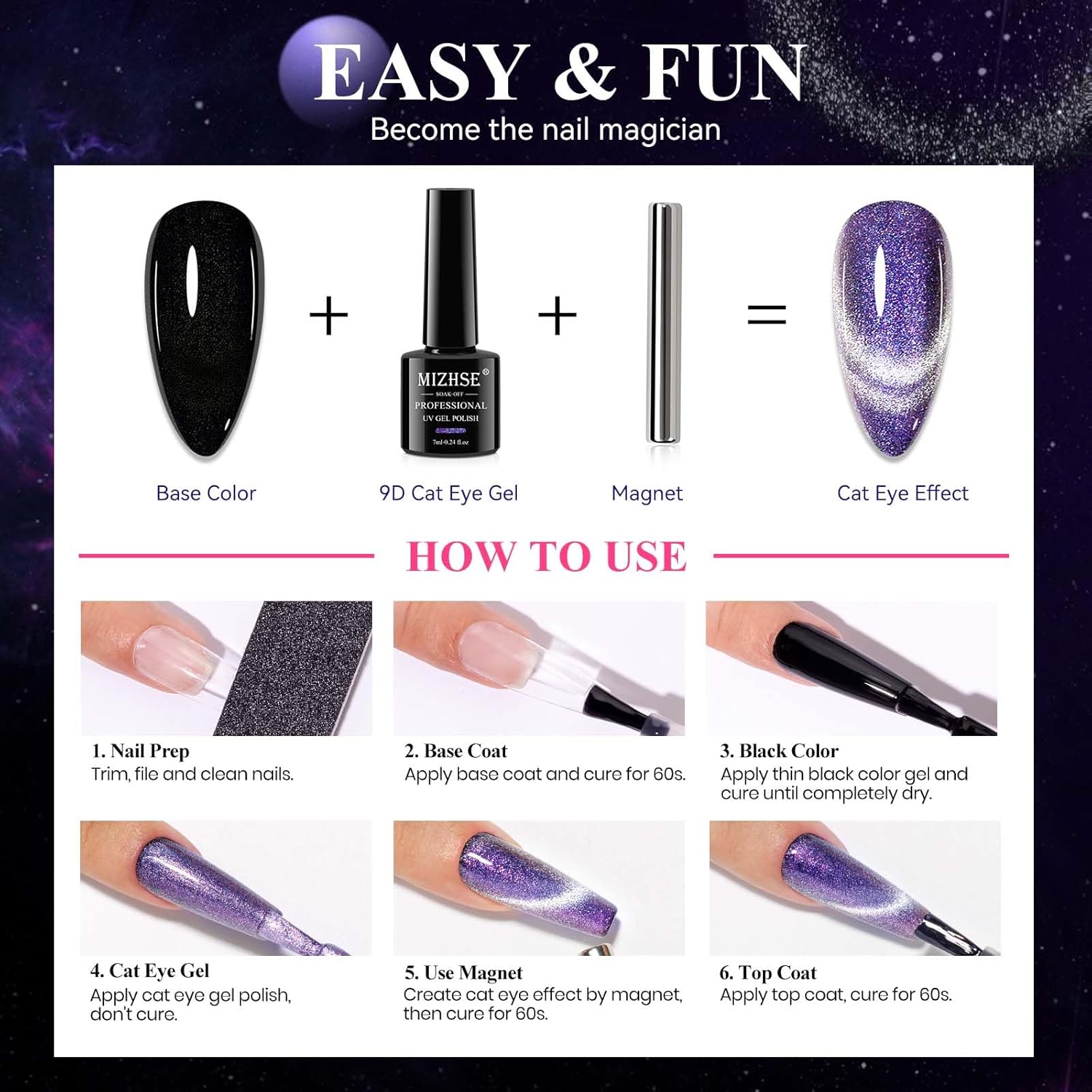 - MIZHSE Aurora Cat Eye Gel Nail Polish: Purple magnetic gel polish, 1 magnet stick. Enjoy the DIY fun of nail beauty at home. Suitable for natural nails, false nails, acrylic nails, etc.
