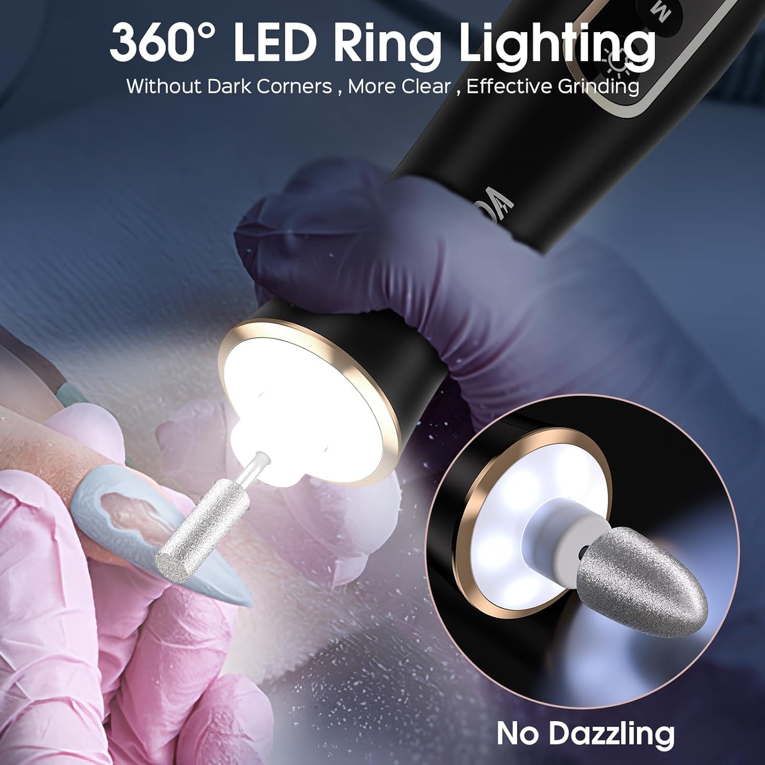 Electric Nail Drill, Professional Manicure Pedicure Kit, Cordless Electric Nail File Set, Rechargeable Pedicure Tools for feet, 10 Speeds Hand Foot Care Nail Drill for -360° LED Light Black