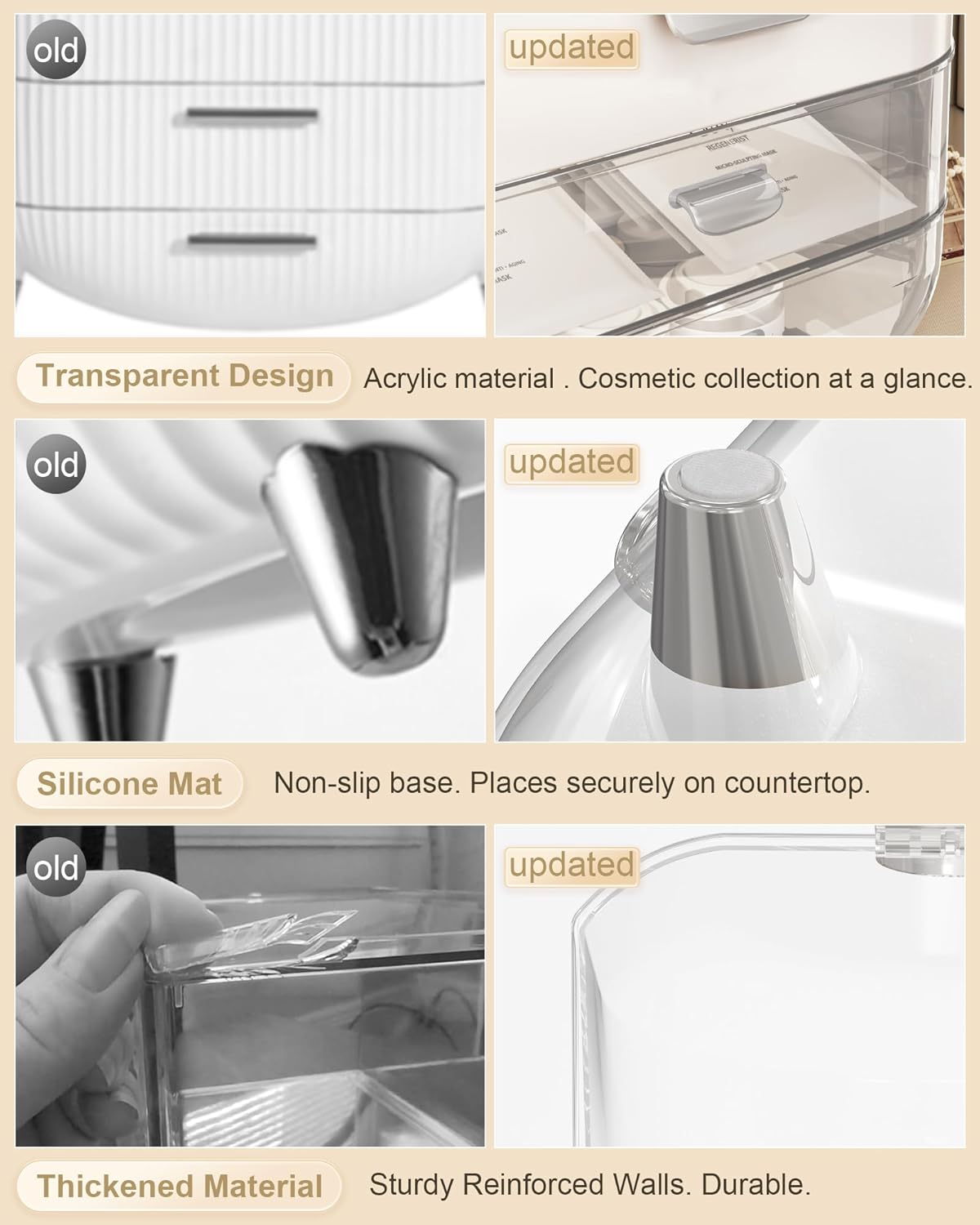 - ăThickened Material & Non-slipăReinforced and upgraded handle won't fall off. Easily move the skin care organizer to anywhere. The countertop organizer is made of thickened ABS material, which is stronger and more durable than normal ones. Drawer and clear top are able to open and close easily. Rubberized bottom, non-slip and won't scratch desktop.
