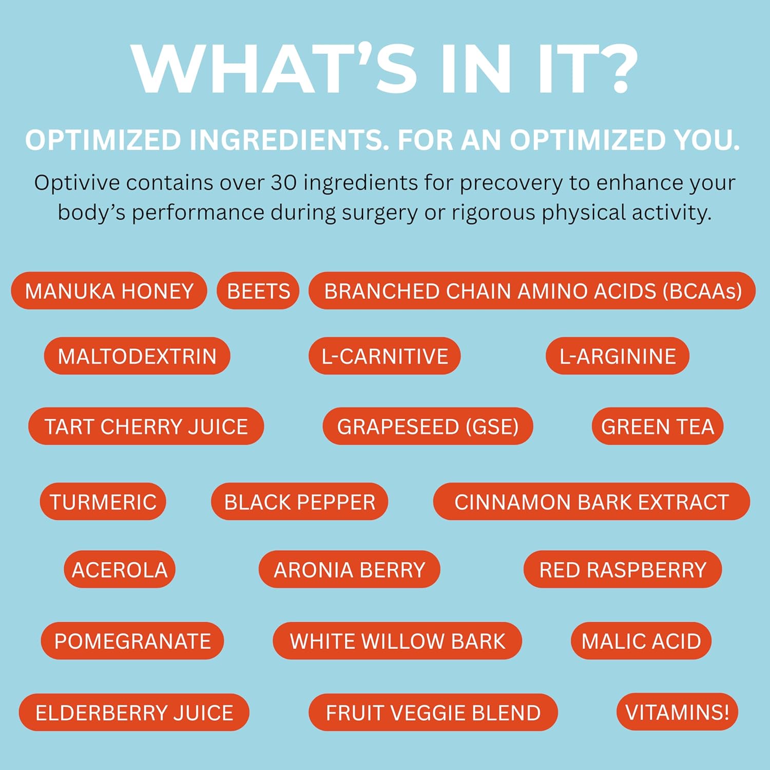 - Pre Surgery Drink - Specifically designed for patients undergoing surgery, Optivive is a "clear" liquid meal to prepare your body for the stress and rigors the body will endure. It's a pre surgery beverage that provides fast-digesting energy, immune support, discomfort relief, and ingredients to help aid in a period of convalescence.
