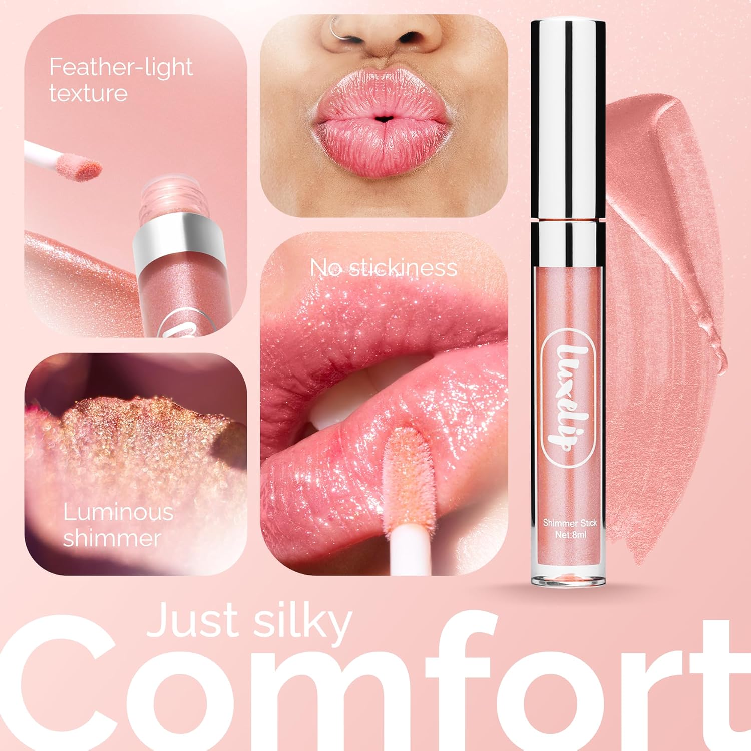 - Subtle Shimmer Effect: Delivers a luminous glow with light-catching shimmer for a fuller-looking, glossy pout.