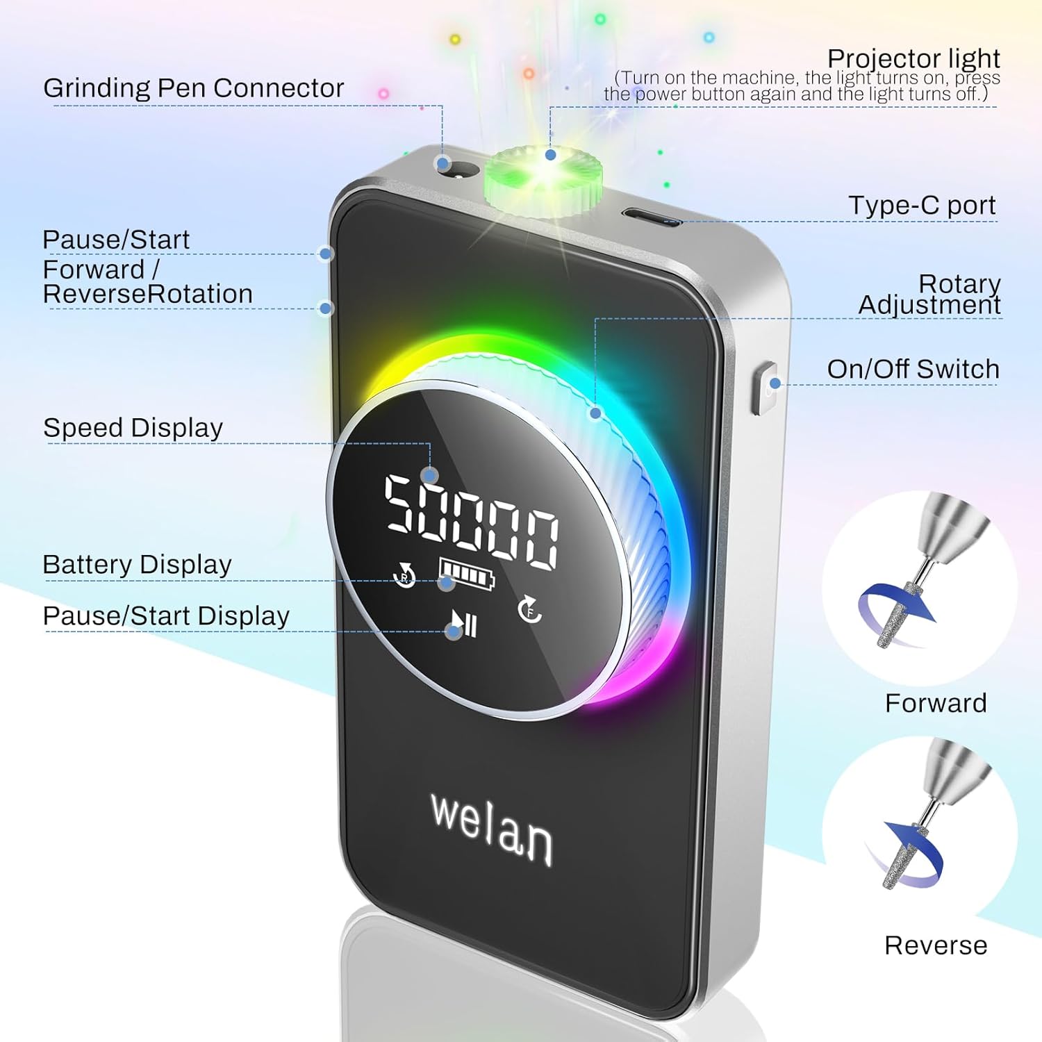 - 【High Speed up to 50000RPM】Welan rechargeable nail drill is equipped with premium power bank, which enables it work smoothly at high adjustable speed (0-50000) RPM by rotating the speed, easy to control. It is an ideal nail drill for acrylic nails professional technicians in-salon.