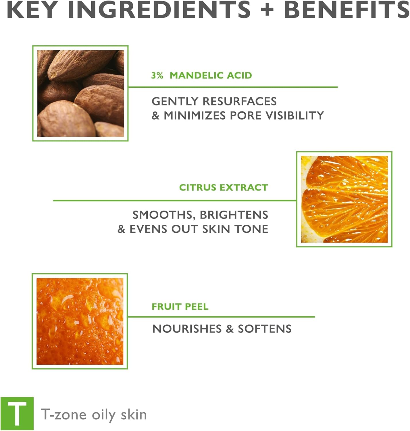 - EXFOLIATES & BRIGHTENS – Mandelic acid clears dead cells and unclogs pores, while citrus extract and fruit peel fade discolorations. Leaves skin smoother, softer, and more radiant without causing dryness.
