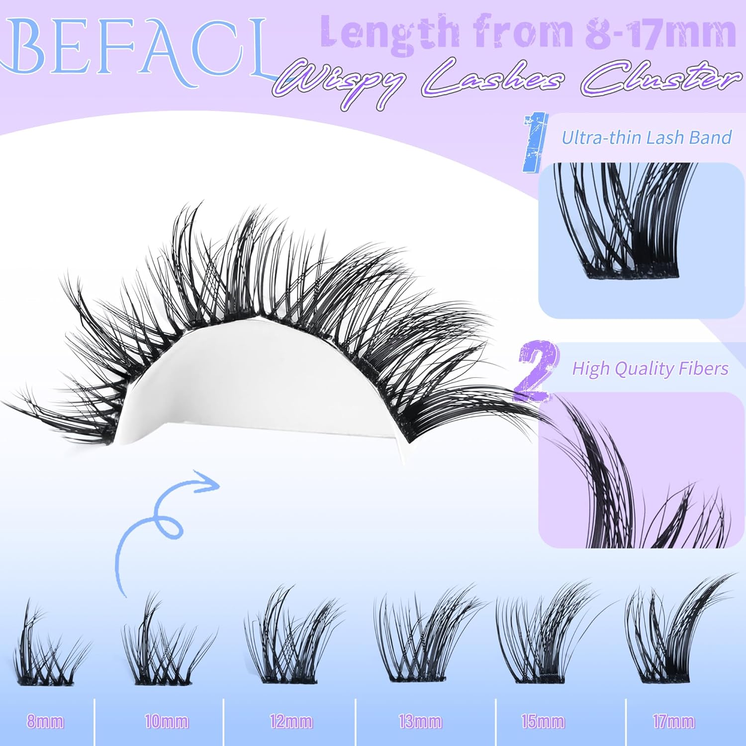 - 【Spiky Lash Clusters Kit】Wispy cluster eyelash extensions kit contains 8-17mm wispy eyelash clusters, bond and seal lash glue and lash tweezers.These eyelashes clusters unique spiky design, ultra-light material, they are comfortable to wear,the label also has signs of left eye and right eye, which is very convenient to wear