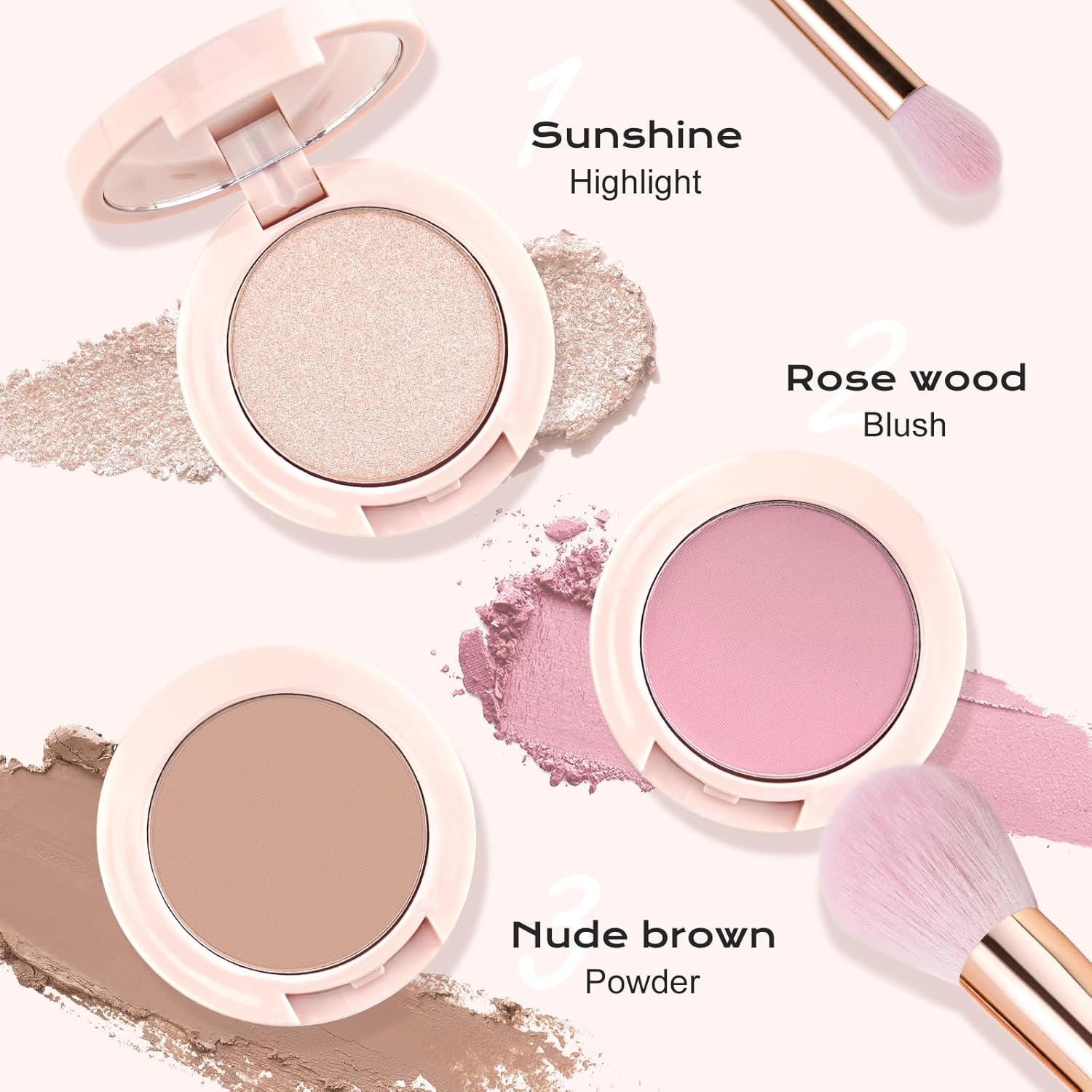 - 3-IN-1 Makeup Palette -- This trio is a stacked, comes with a Blush, Contour and Highlighter in a bite-sized palette.Multi-colored makeup palette is a perfect blend of daily complimentary hues Also as contour to accentuate & enhance cheekbones for a fresh, healthy natural-looking flush.
