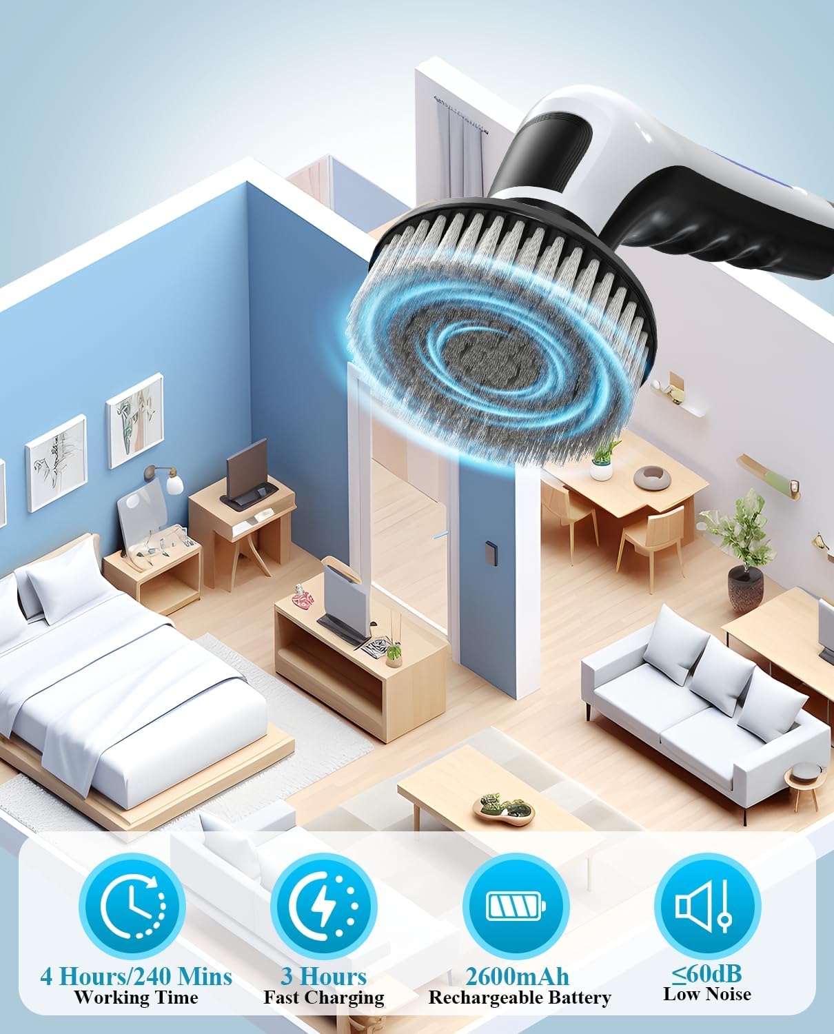 - UPGRADED Household Cleaning Brushes - 3 Adjustable Speeds (350/380/420RPM) / Extendable and Detachable Handle / Digital Display Screen / 9 Replaceable Brush Heads / IPX7 Waterproof / Type-C Charging Port / 240 Mins Working Time / 3 Hours Fast Charging Low Noise β€60dB / Brush Storage Bag & Hook