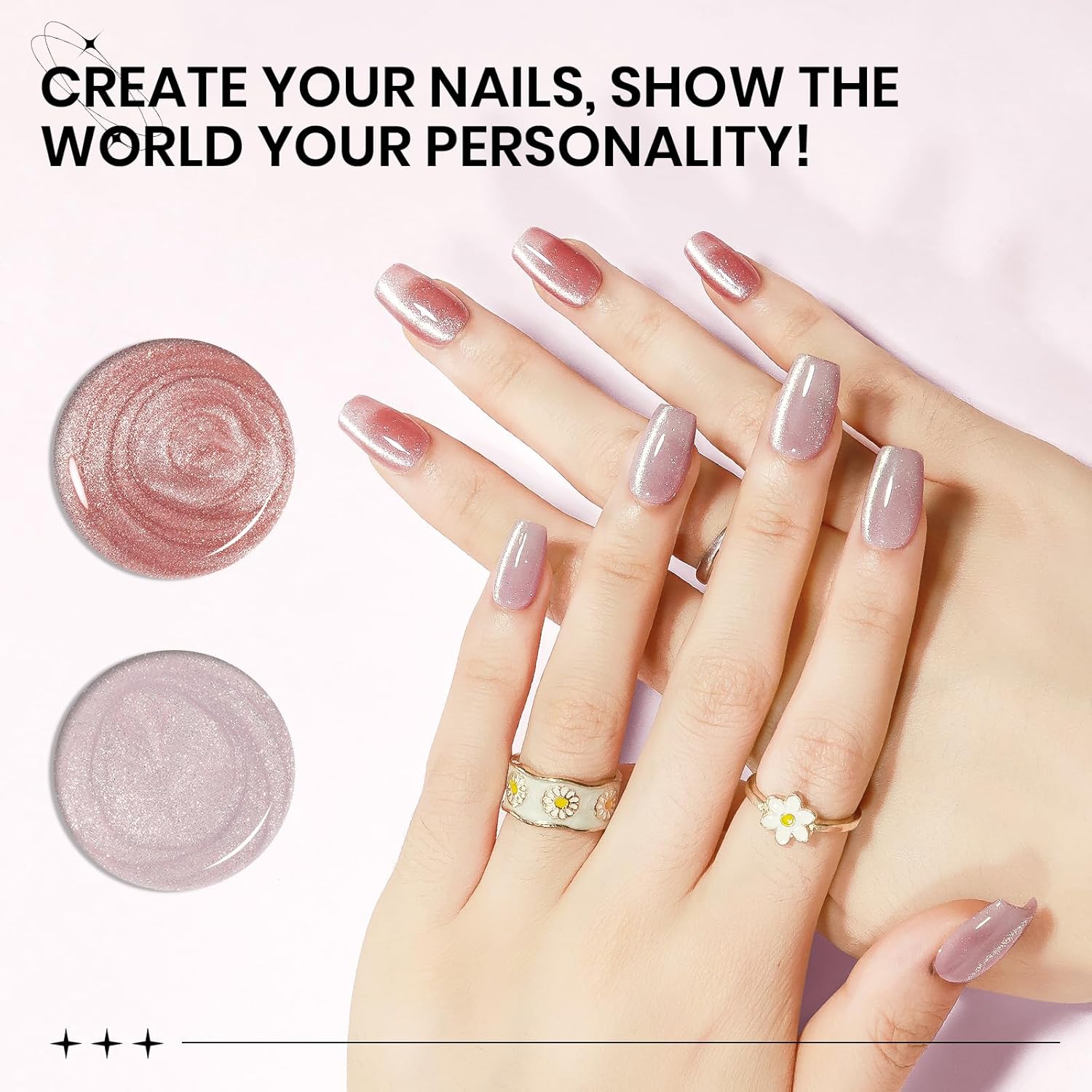 - 2PCS Cat Eye Gel Polish: 2*15ml(0.5fl oz) nude and pink cat eye gel nail polish with 1PC magnetic stick. Mixed with smoothie magnetic glitter, it's perfect for making a statement