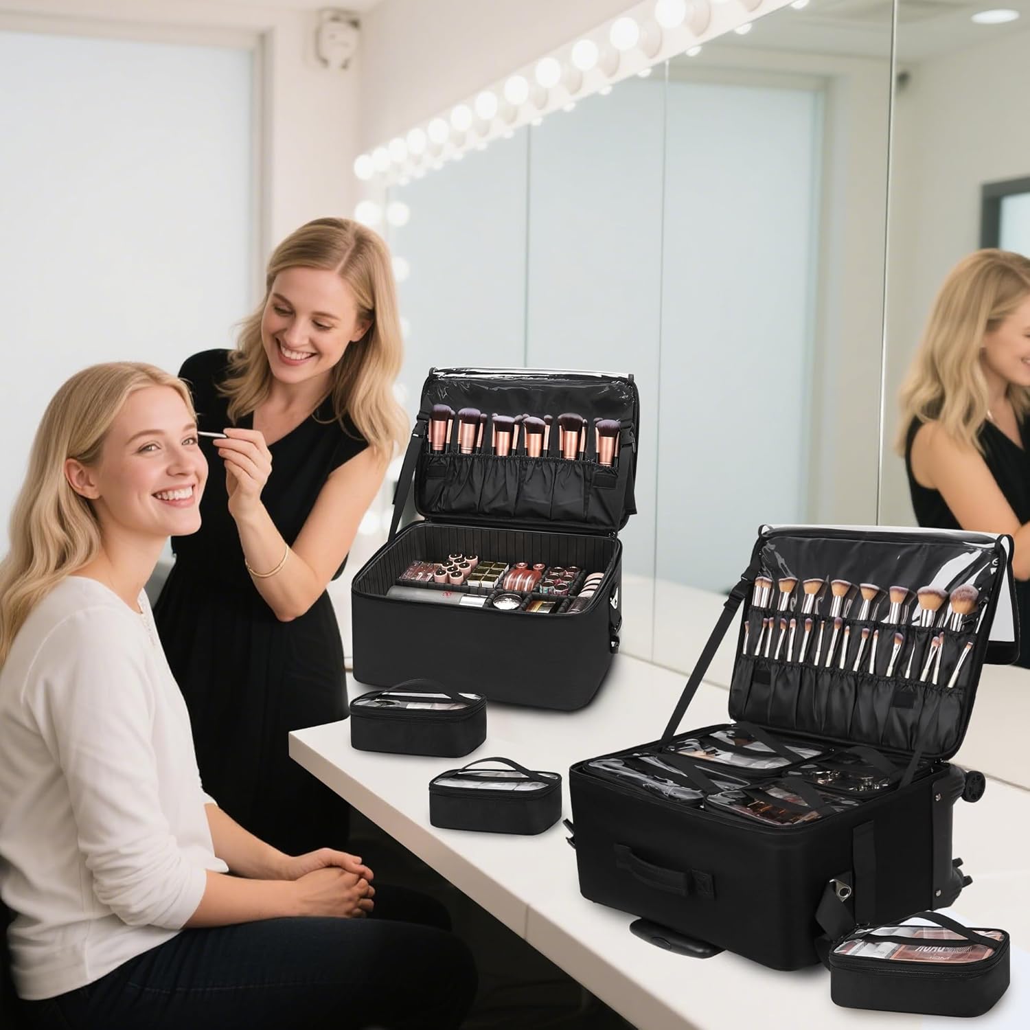 - 【High Quality Material】: Rolling makeup case made of high quality waterproof material, durable ,smooth metal zipper, easy to open, lining is made of easy-to-clean fabric, with an added transparent piece at the bottom to make it easy for makeup artists to clean and organize their cosmetics