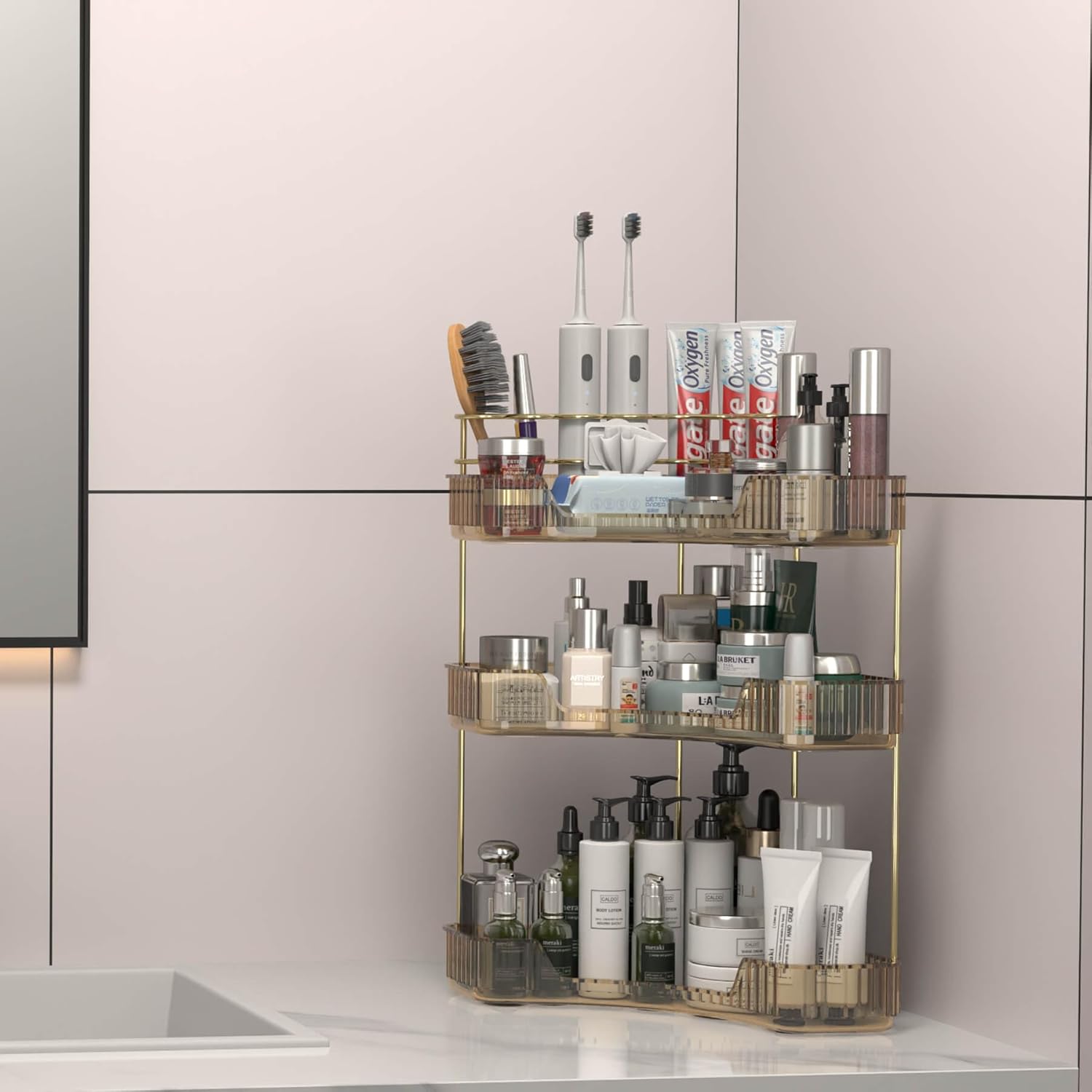 Corner Bathroom Counter Organizer with Top Toothbrush Holders, 3-Tier Make Up Organizers for Vanity with Brush Holder, Corner Storage for Bathroom, Kitchen, Dresser