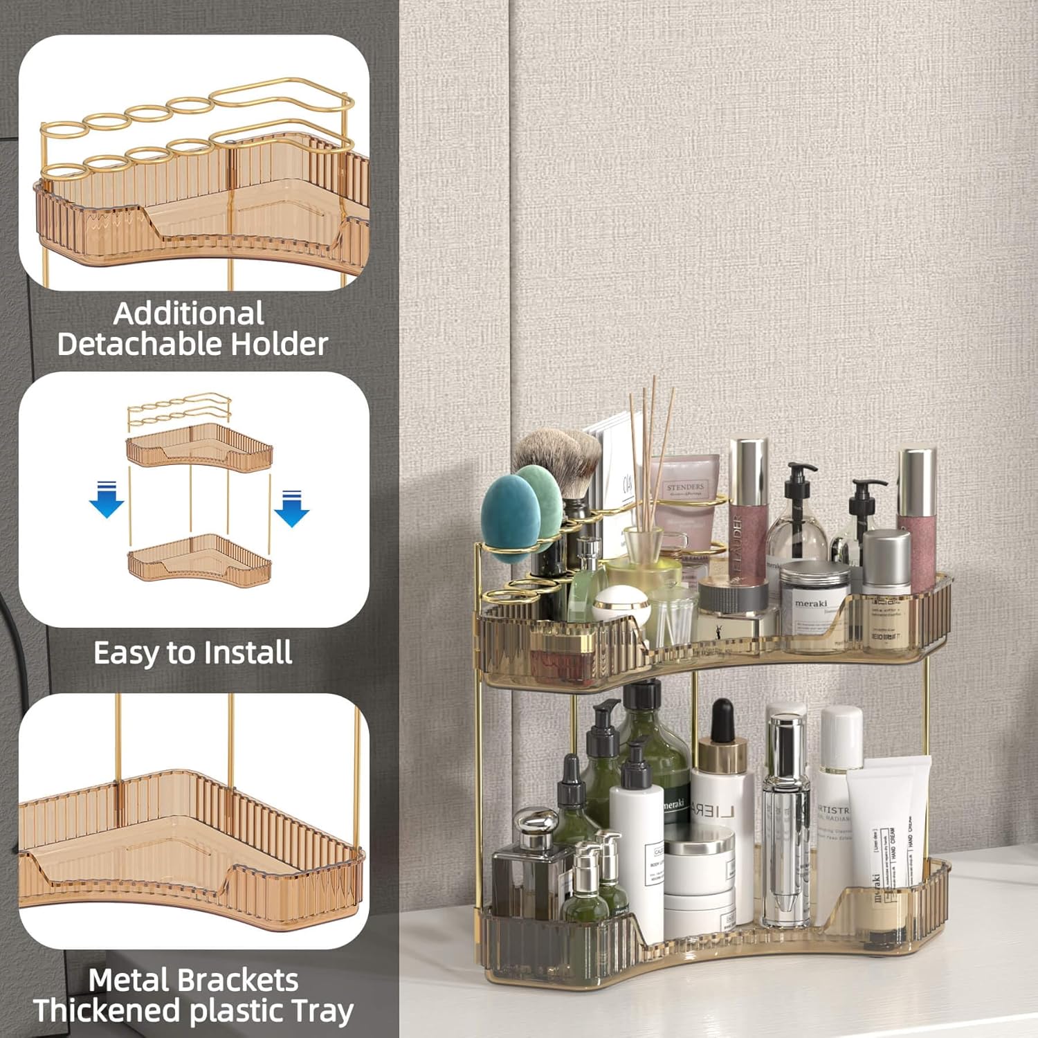 - 【Makeup Organizer Countertop With Brush Holder】The corner bathroom countertop organizer has a new compartmentalized metal holder at the top, which not only organizes makeup brush beauty egg , but also toothbrushes and more!