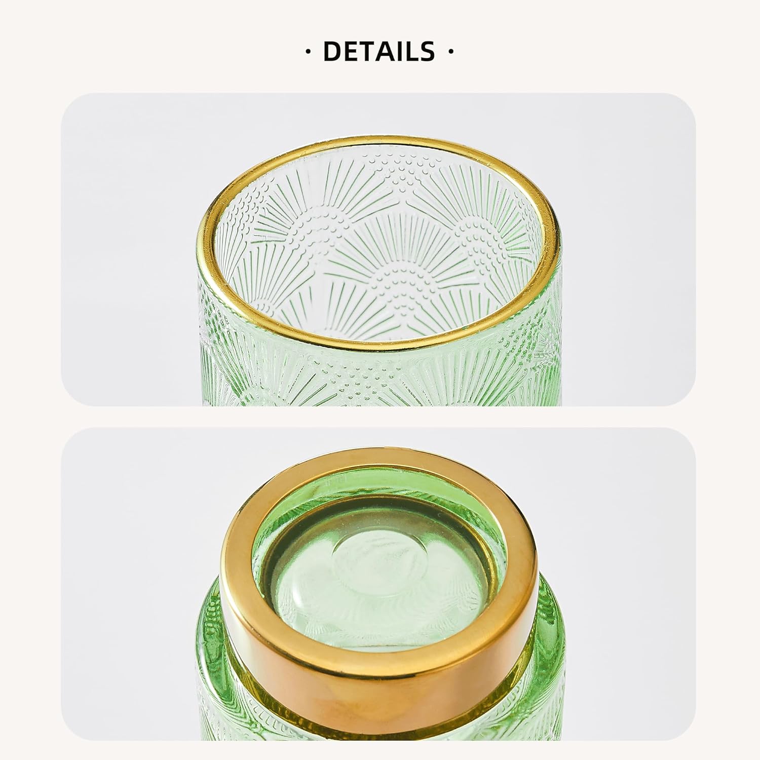 - Exquisite Design: Made of high-quality glass and a golden metal base.Its exquisite striped design on the glass body, complemented by the metal gold plating on the bottle mouth's top edge,sturdy and stylish.