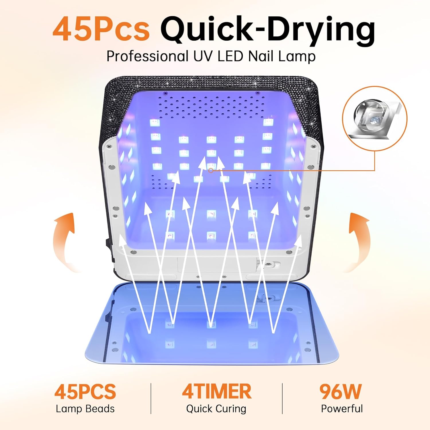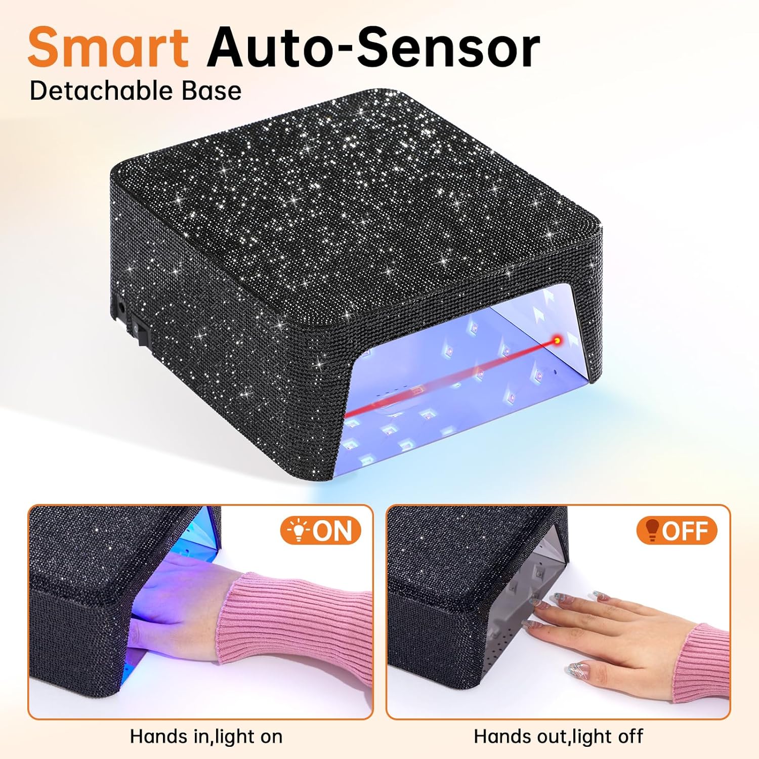 - 【User-Friendly】Our sparkly diamond nail lamp features a touch LCD display with 4 timer settings: 15s, 30s, 60s, and 90s. The infrared sensor lights automatically activate when your hand is placed under the flash cure lamp and turn off when it's removed, ensuring the curing process is efficient and time-saving