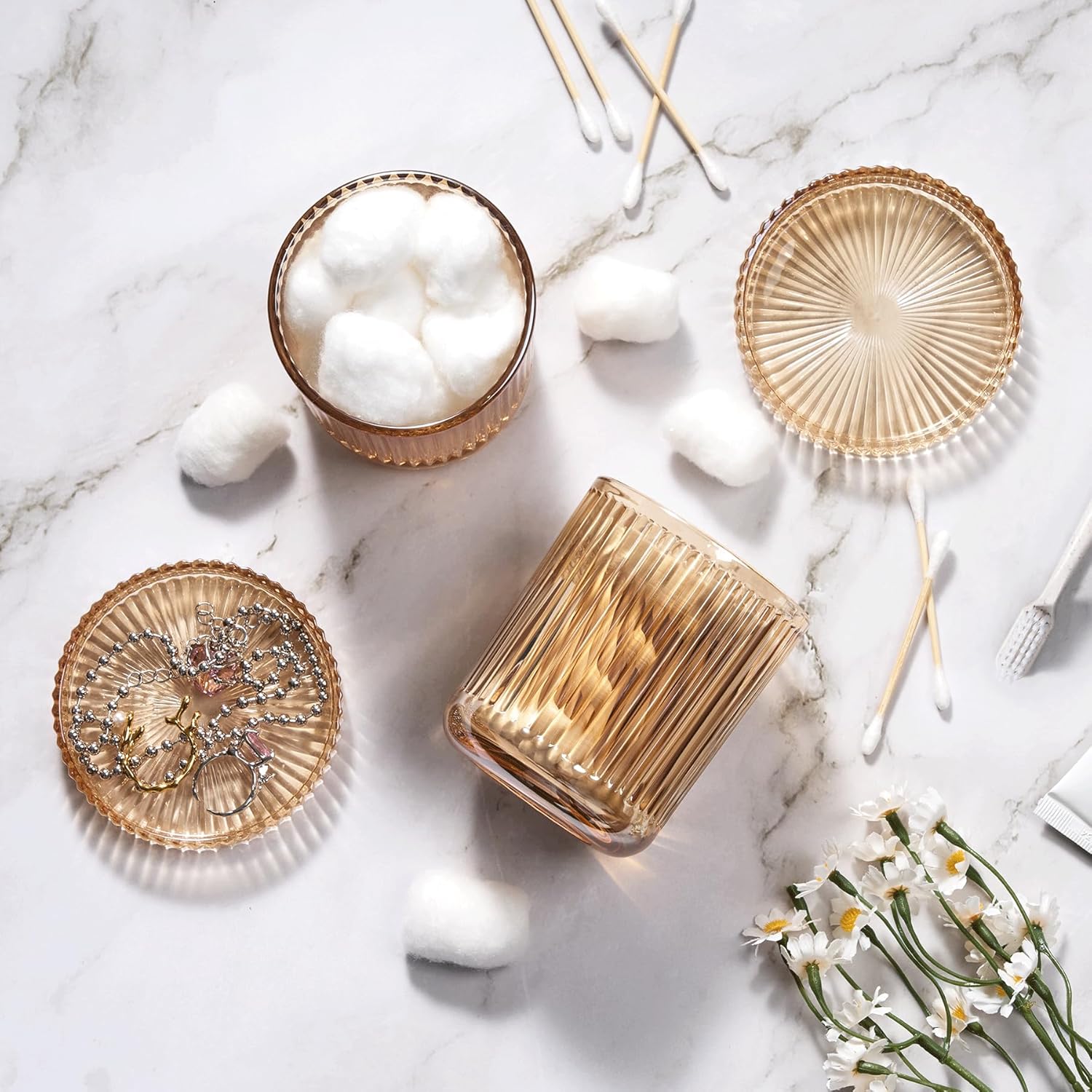 2 Pack Glass Qtip Holder Dispenser Set - Bathroom Organizer for Cotton Swabs, Balls, Pads, Floss Picks - Clear Apothecary Jars for Vanity, Makeup Storage, Bathroom Accessories Decor (Amber)
