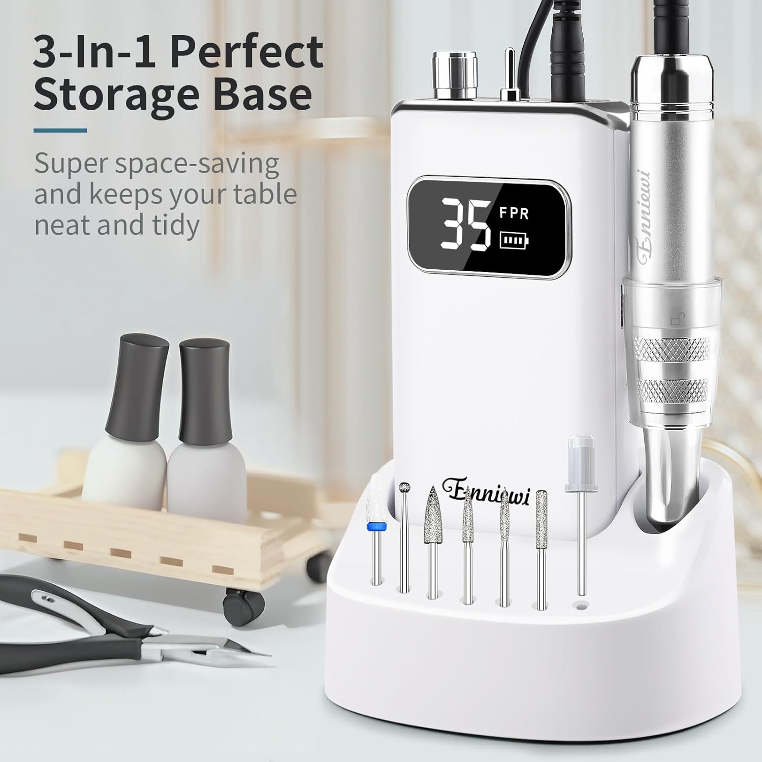 - 【Salon-Grade Power & Professional Nail Drill Kit】Enniewi electric nail drill has a breakthrough upgraded high-torque motor that runs smoothly and quietly even at high speeds of 35,000 RPM. The patented cooling and shock absorbing system effectively dissipates heat, prevents damage to nail surface and cares for sensitive nail edges. Whether you're doing a basic mani/pedi or fine nail art, it can increase operation efficiency by 60%, making salon-quality nail care easy!