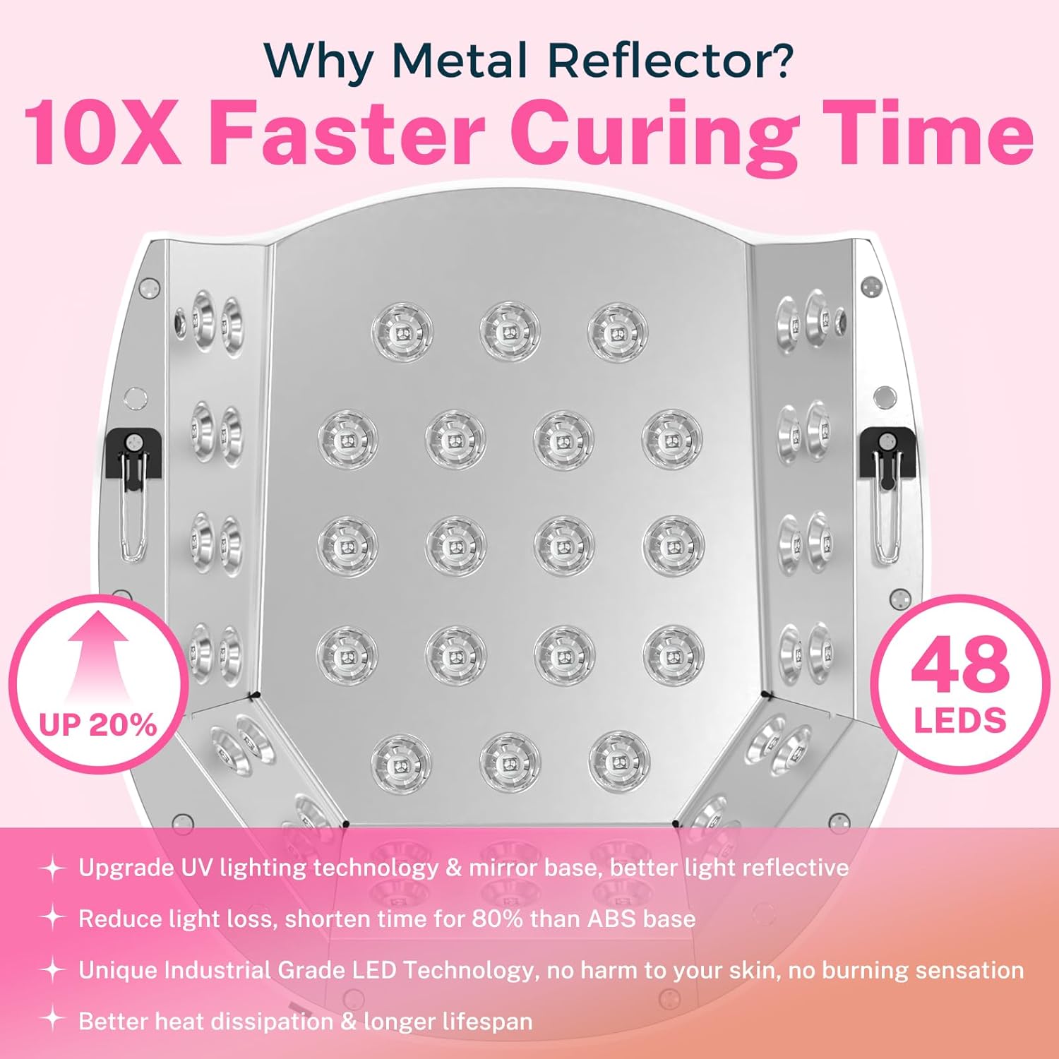 - Removable Metal Bottom Tray: The UV lamp for nails has a large internal compartment, and the support with a sense of design can make the space higher. It can easily cure nails without fear of bumping the side or contaminating nail polish, no more worries about uneven curing. Mirrored metal baseplate enhances reflectance efficiency to optimize curing performance.