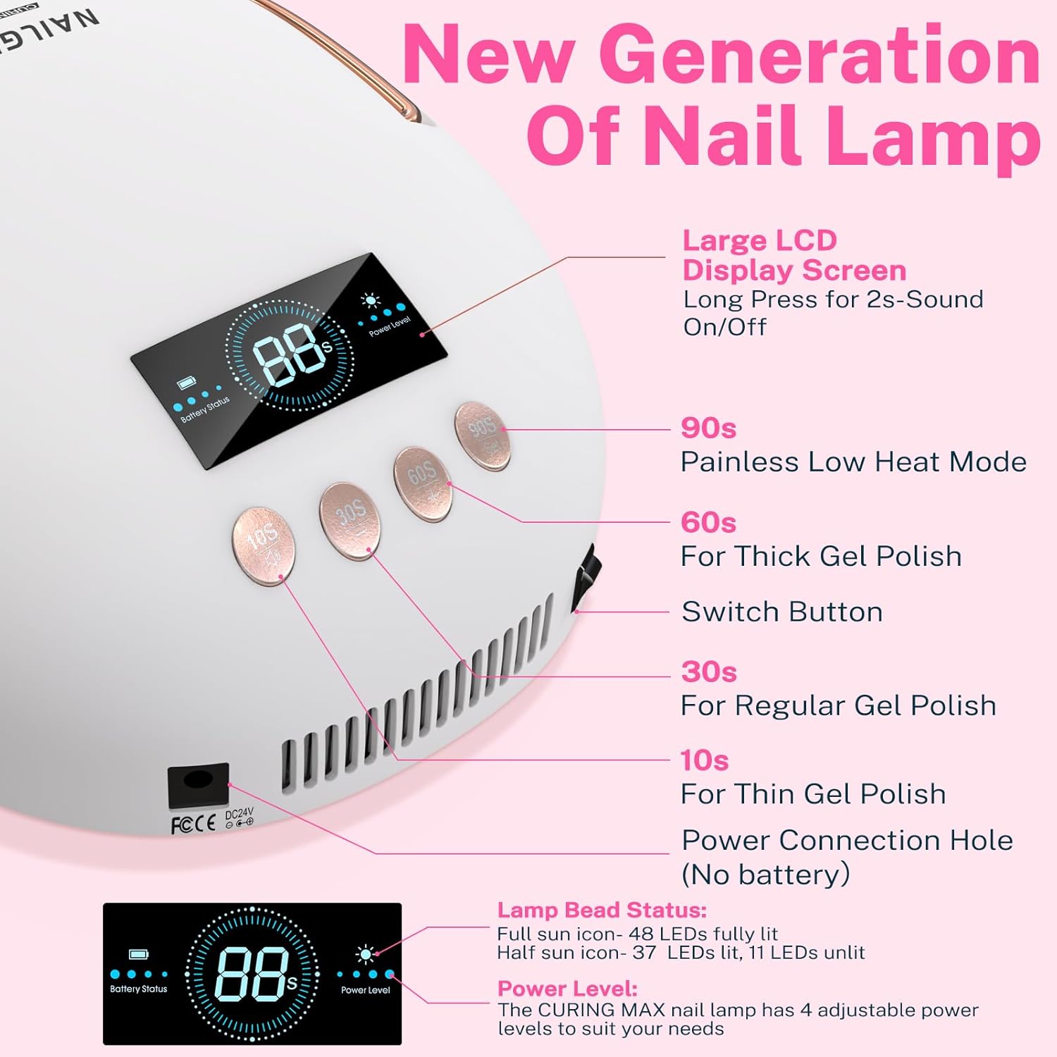 - Smart Sensor & LCD Display: The professional UV LED nail lamp is equipped with a high-definition LCD display screen and 4 timers (10 ', 30', 60 ', 90') to meet your specific needs, and low heat mode keeps it comfortable throughout the process. The nail dryer for gel polishing is also equipped with an automatic infrared induction lamp. Long press the settings button to adjust the intensity of the light source, Activate 37-bead mode to prevent black hands with precision light control, providing a stronger sense of experience.