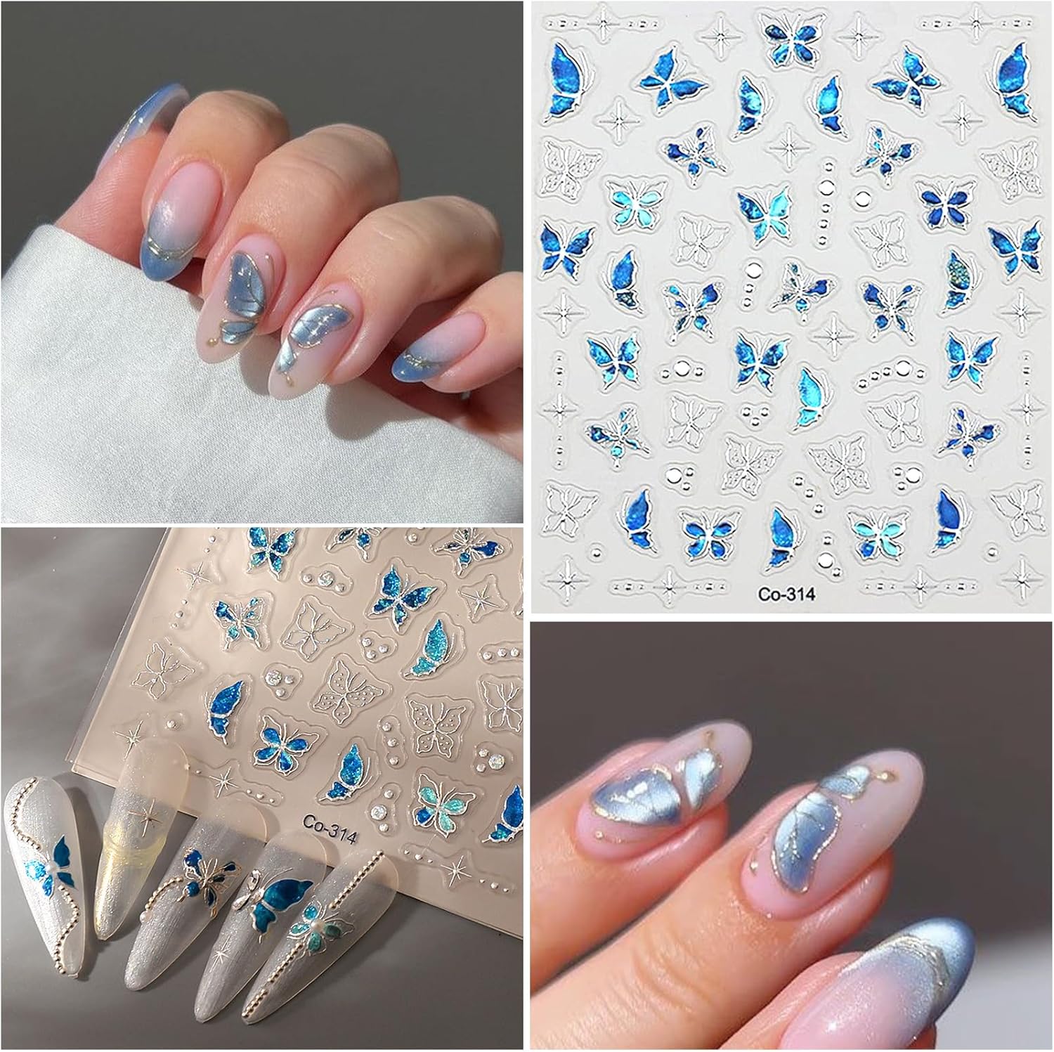 Spring Flower Nail Art Stickers Decals Blue Green Butterfly Nail Decals Self Adhesive 5D Embossed for Women Nails Design Decoraion 3D Flower Mails Stickers Supplies