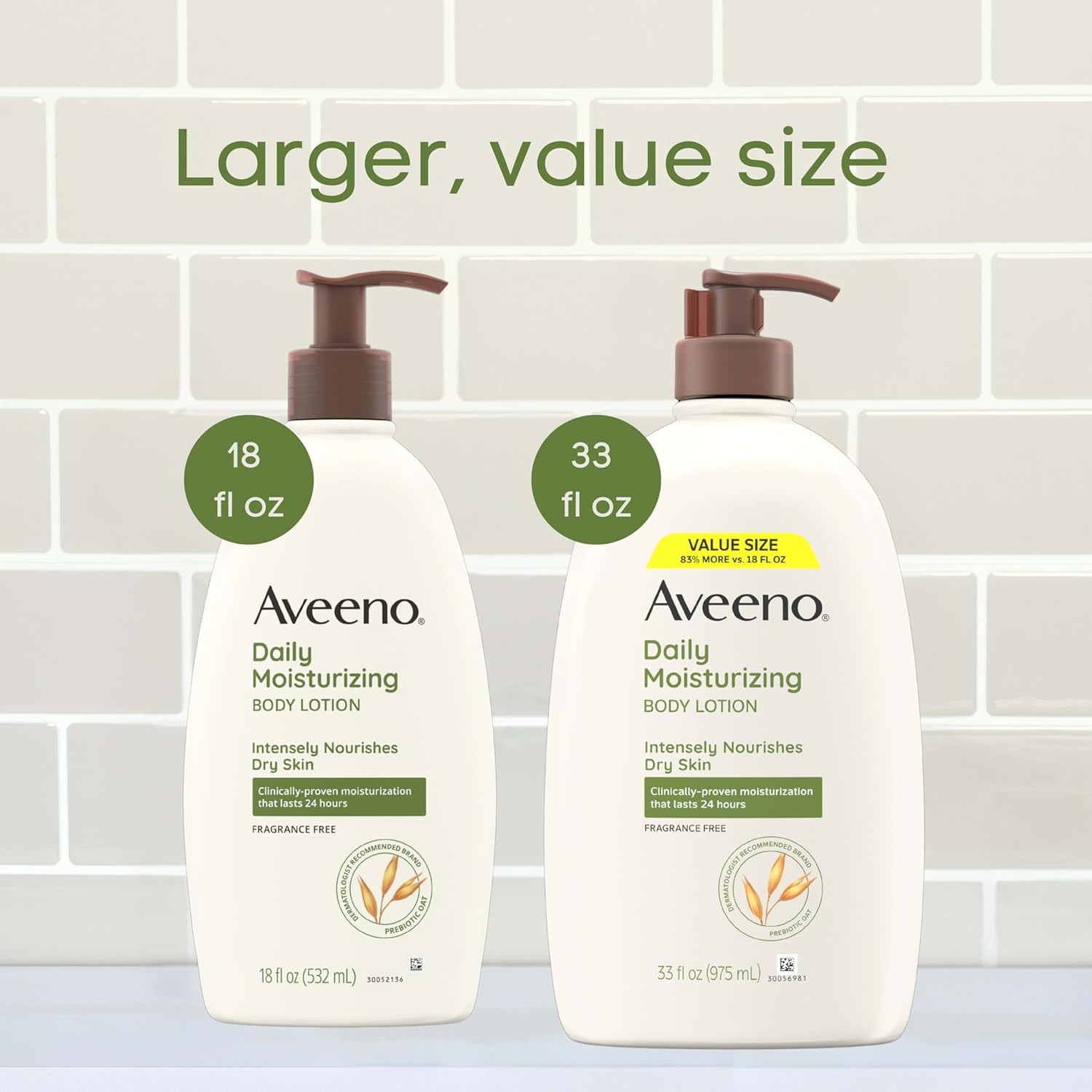- 33-fluid ounce value size bottle of Aveeno Daily Moisturizing Body Lotion with Prebiotic Oat intensely nourishes dry skin with clinically proven moisturization that lasts for 48 hours*. To use, apply daily as often as needed