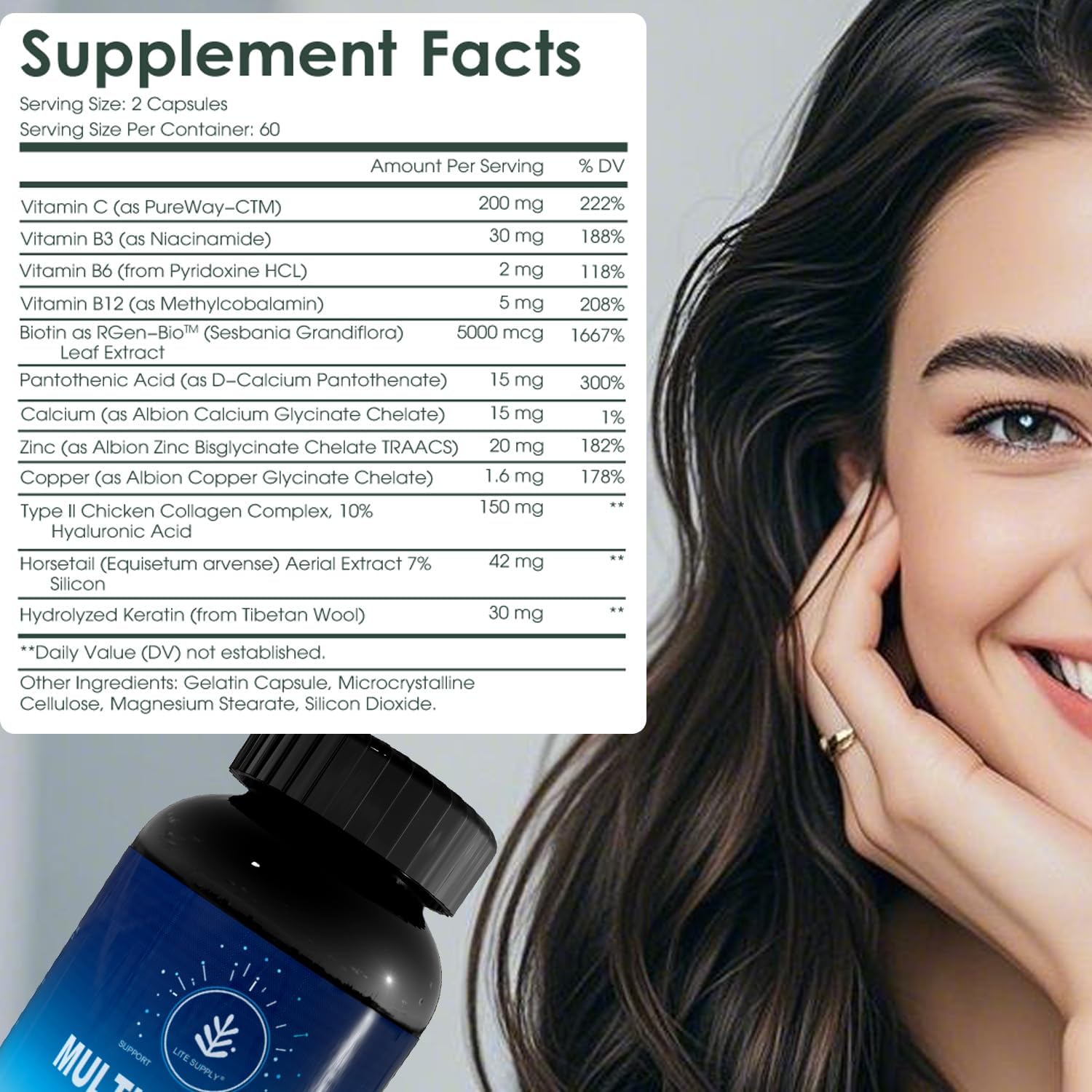 - Hair & Skin Support Supplement: This dietary supplement is formulated with key vitamins and minerals specifically chosen to support healthy hair growth and skin vitality.
