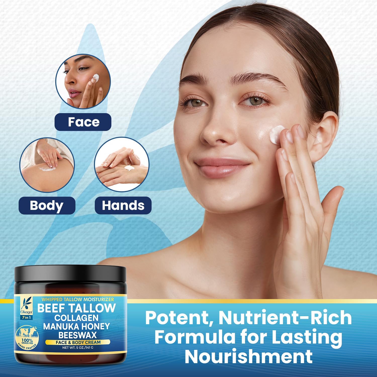 - Multi-Purpose Daily Moisturizer: Designed for all skin types, Okaga Beef Tallow Balm can be used as a daily facial moisturizer, nourishing body lotion, or soothing lip balm. Free from harsh chemicals and synthetic additives, this gentle yet effective formula keeps your skin feeling soft, hydrated, and comfortable, making it an essential, versatile part of your daily skincare routine.