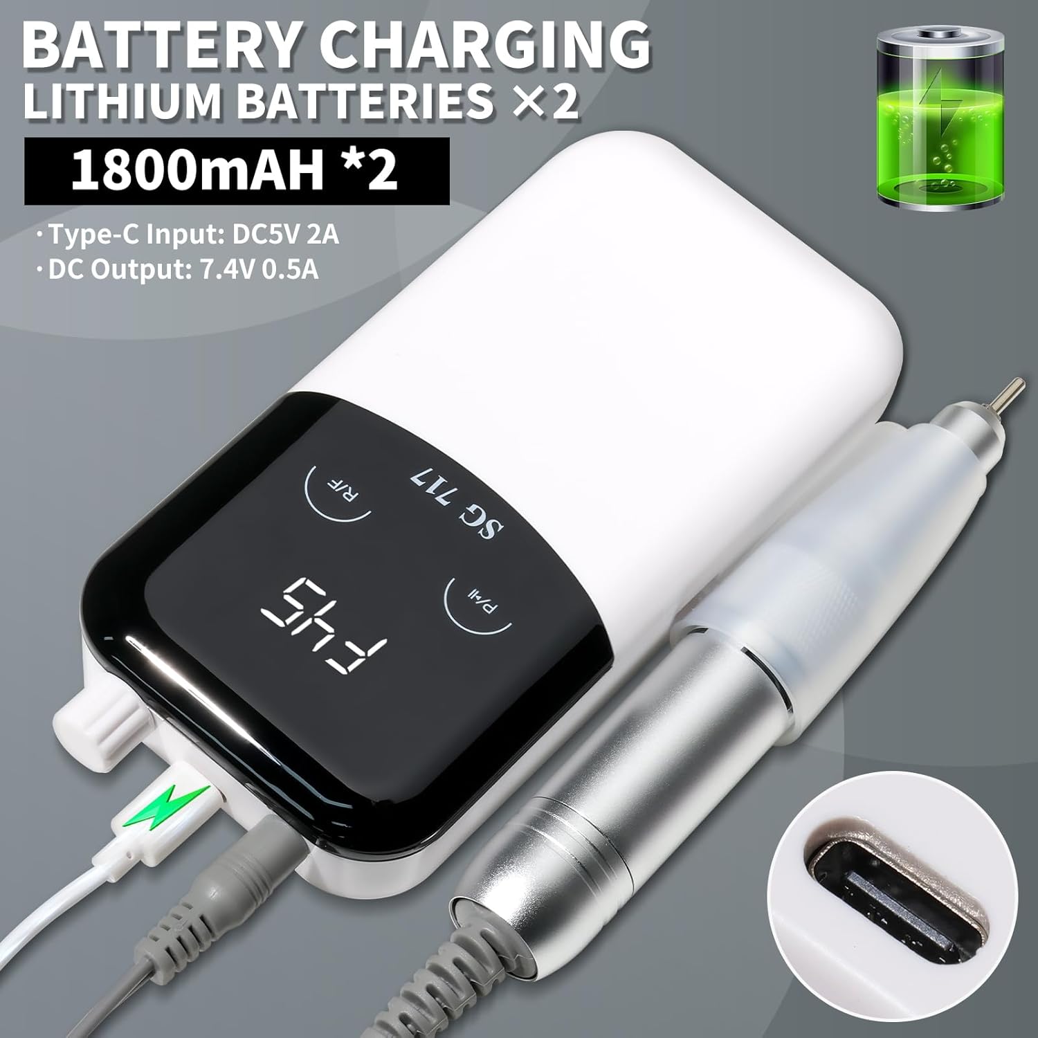 Professional Electric Nail Drill Machine,45000RPM Portable Rechargeable Efile Nail Drill Cordless,Electric Nail File Kit for Women (White)