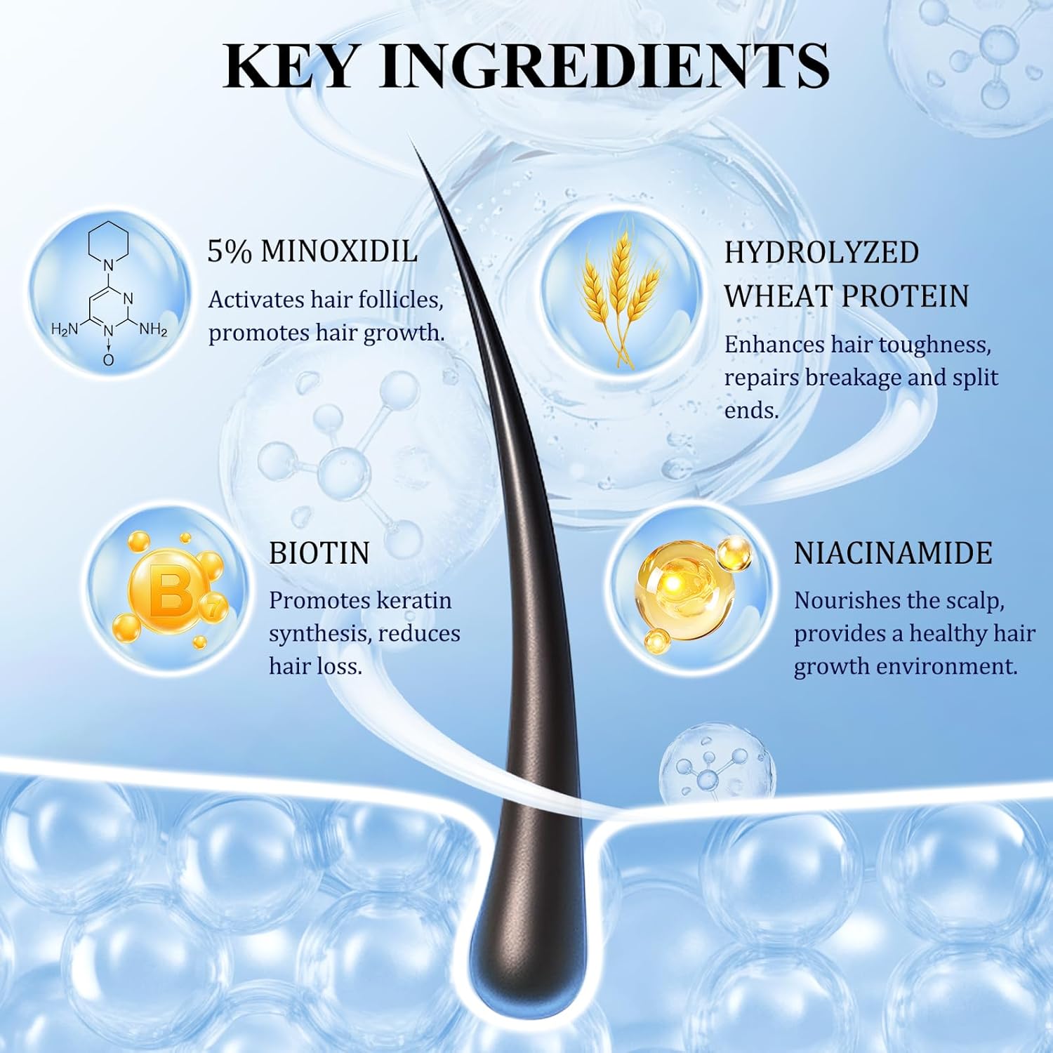 - 5% Minoxidil Hair Growth Spray: Minoxidil - a widely recognized ingredient that revitalizes hair follicles, effectively repairs damaged hair and promotes natural hair regrowth. Minoxidil for men and women hair regrowth treatment.