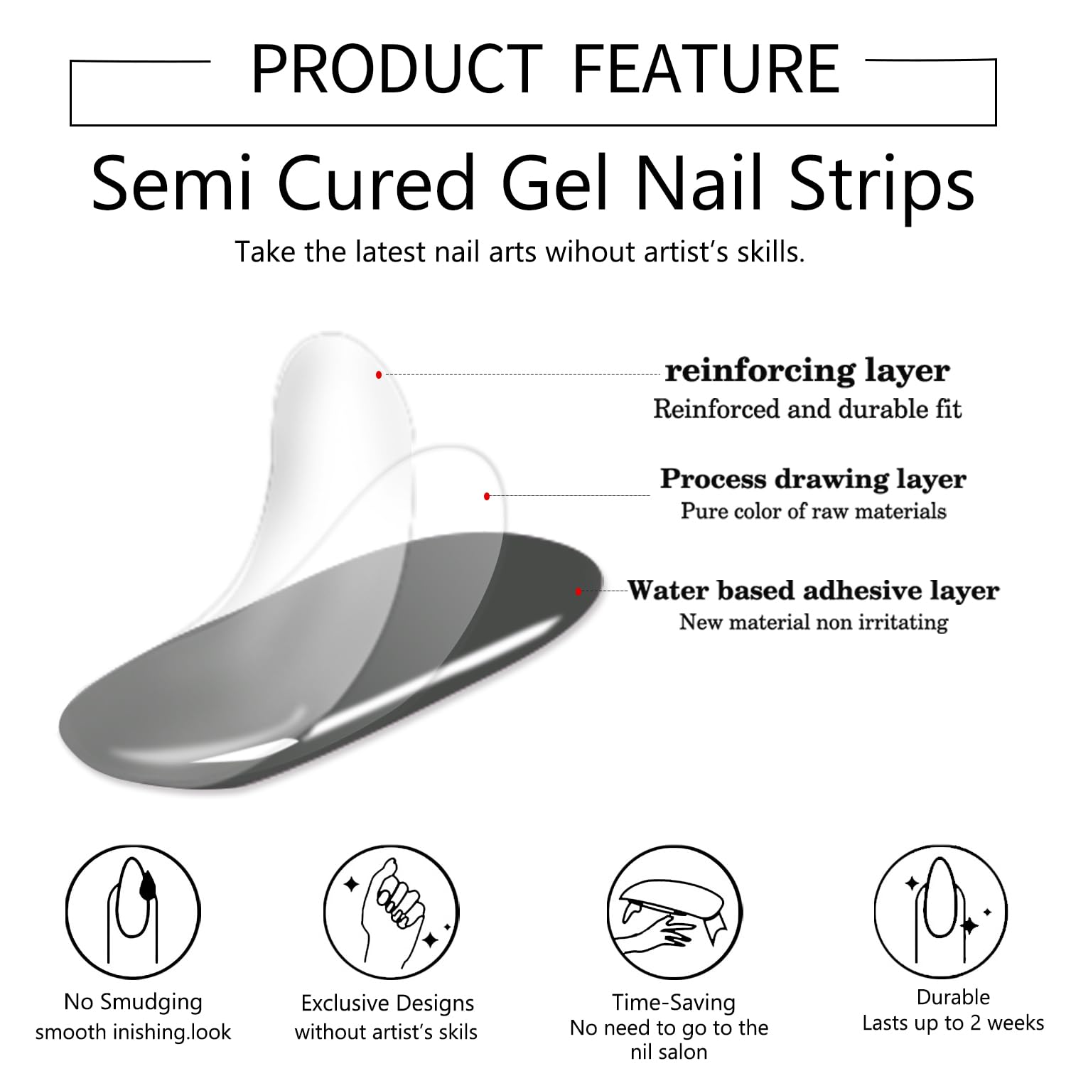 - SALON-QUALITY ELEGANCE - Crafted from superior gel, our semi-cured nail strips are pre-cured to 60%, offering a flexible yet durable texture. After a swift cure (120 seconds) beneath a UV or LED lamp, indulge in salon-like nails lasting approximately 2 weeks. Please note: These strips are not intended for nail extensions.