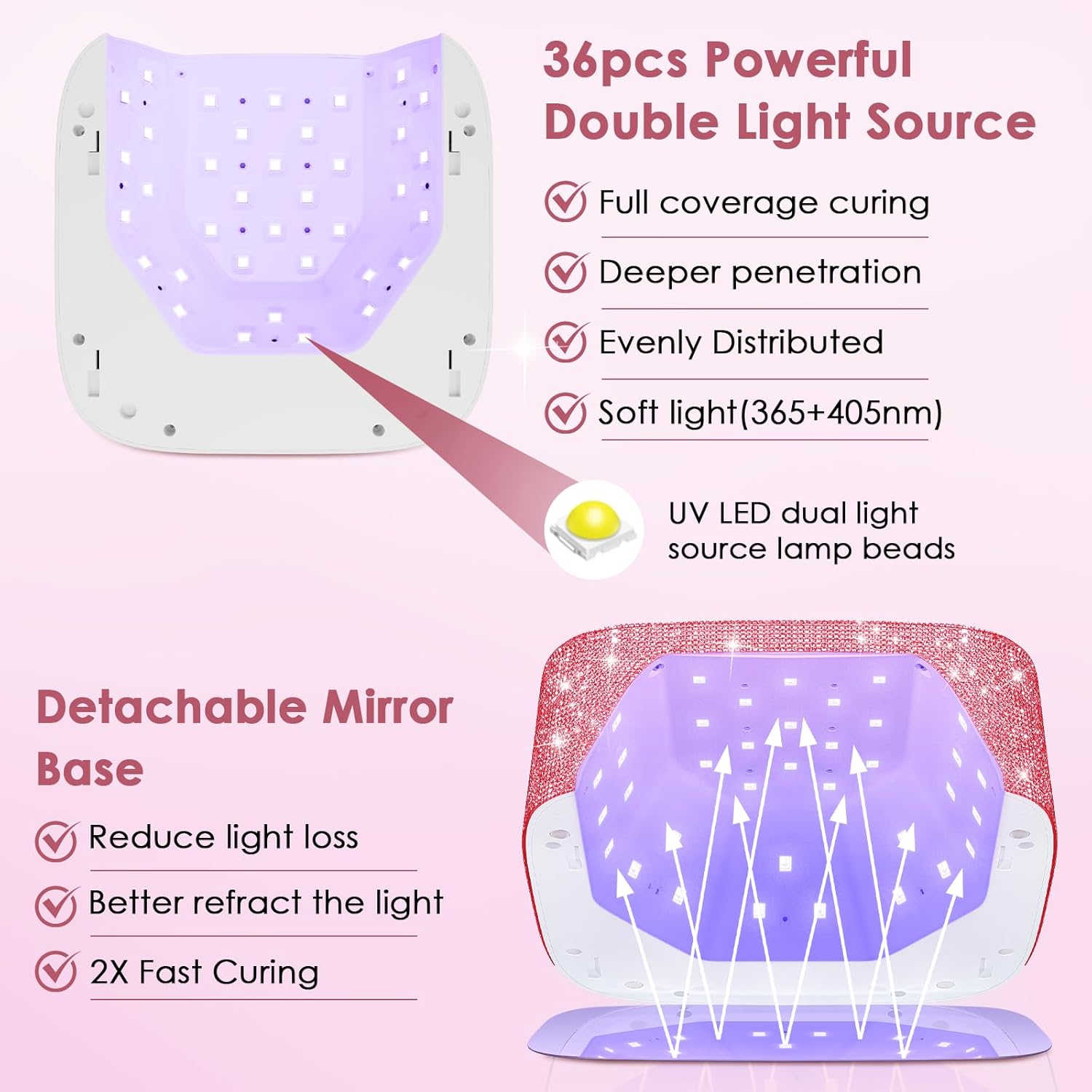 - ๐๐ฉ๐๐ซ๐ค๐ฅ๐ข๐ง๐ ๐๐ข๐๐ฆ๐จ๐ง๐ ๐๐๐ฌ๐ข๐ ๐ง: This bling nail lamp is made of dazzling rhinestones that sparkle and shine! It boasts a beautiful appearance and unique design. The special sparkling diamond embellishment design not only enhances the beauty of the UV nail lamp, but also adds an eye-catching glow, perfect for creating delicate and sparkling nails.