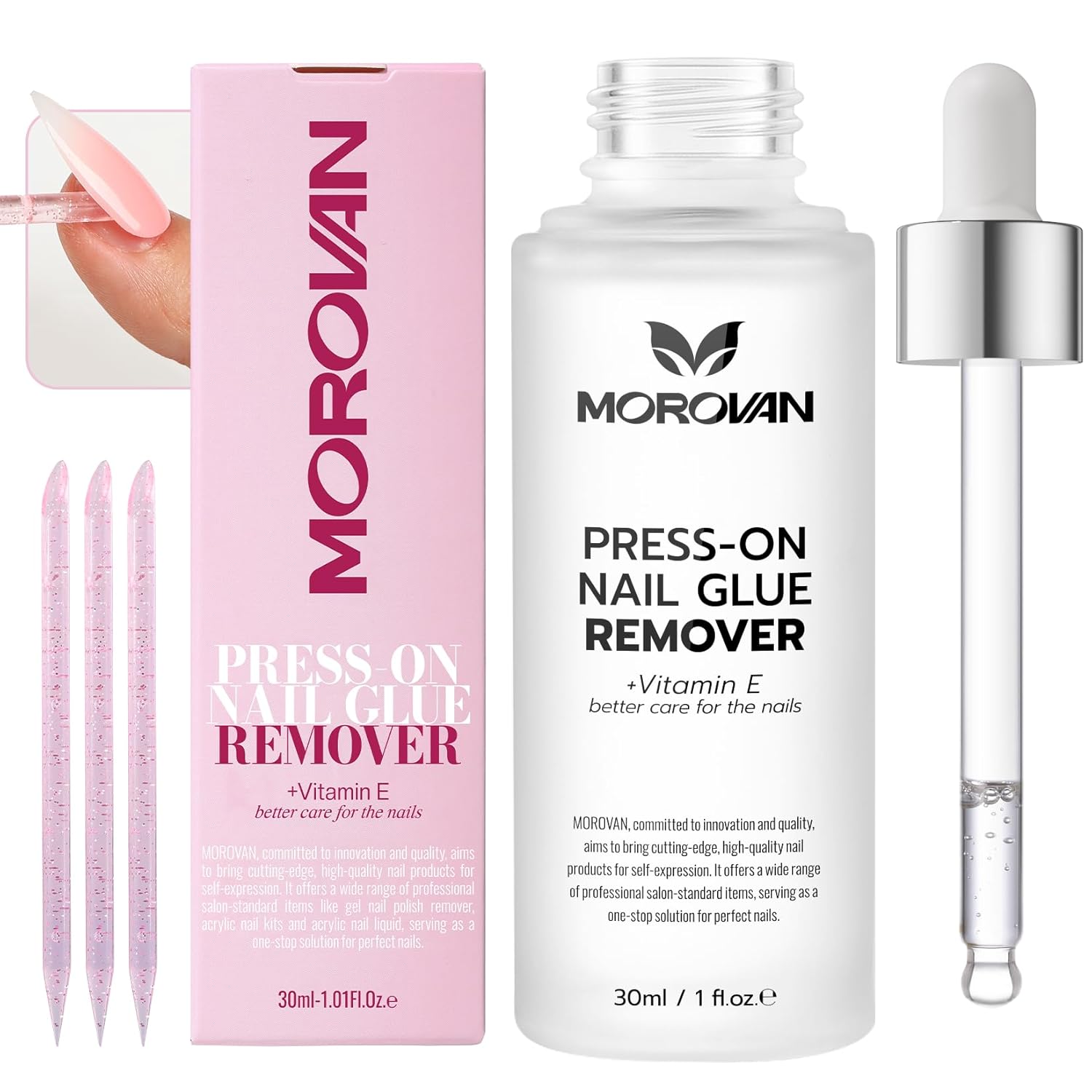- Fast & Gentle & Healthy Nail Glue Remover: Morovan nail glue remover includes 30ml press-on nail remover and nail remover tool, acetone-free, odorless, fast and gentle to dissolve nail glue, while avoiding the erosion of natural nails by traditional acetone-based nail glue removers. With added cuticle oil + vitamin E ingredients.