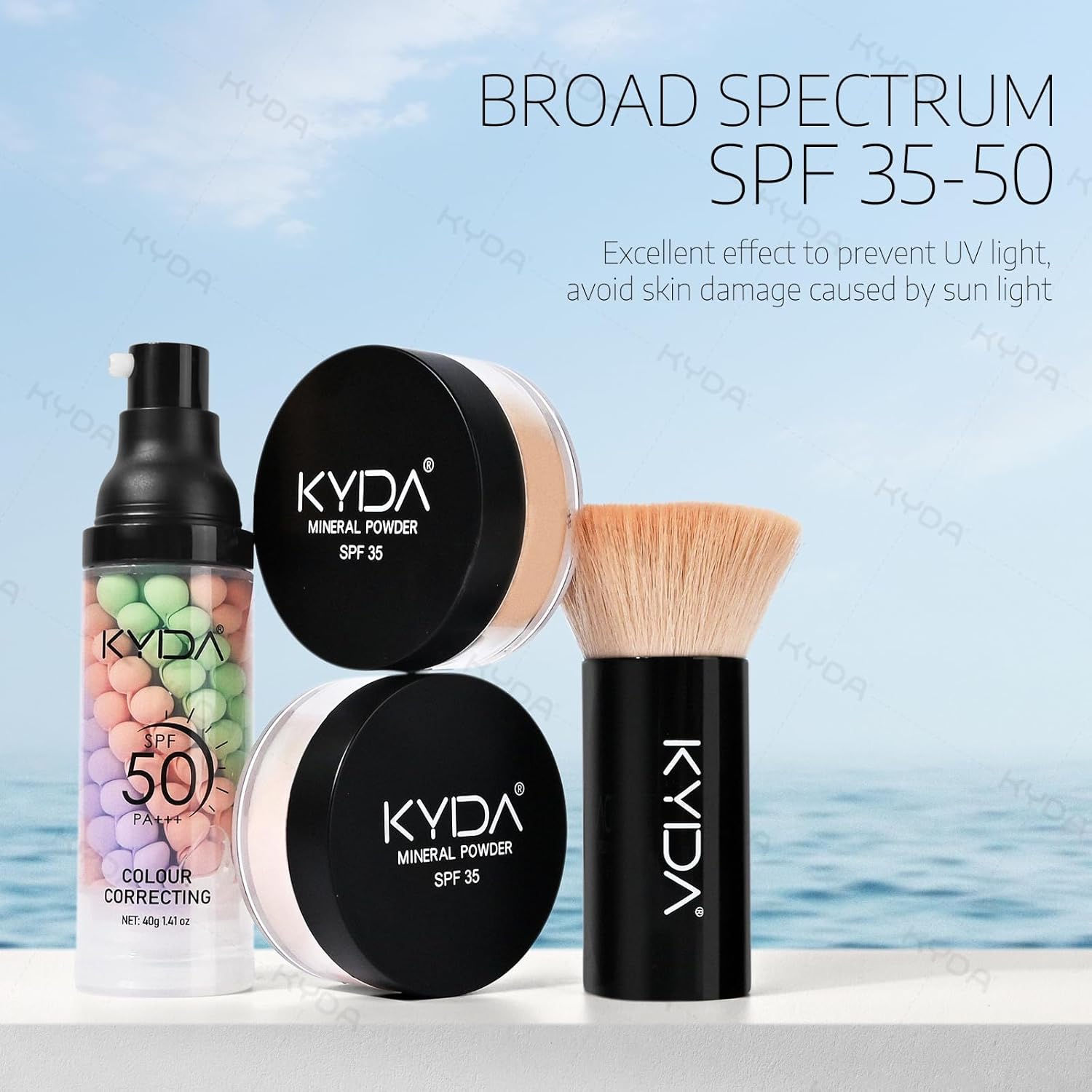 - KYDA MINERAL MAKEUP KIT –Our mineral makeup starter kit featuring a full size of SPF 50 Color Changing Facial Serum + SPF 35 Mineral Loose Foundation, a full size Foundation Brush, and Mineral Loose Setting Powder for a healthy-looking makeup effect.