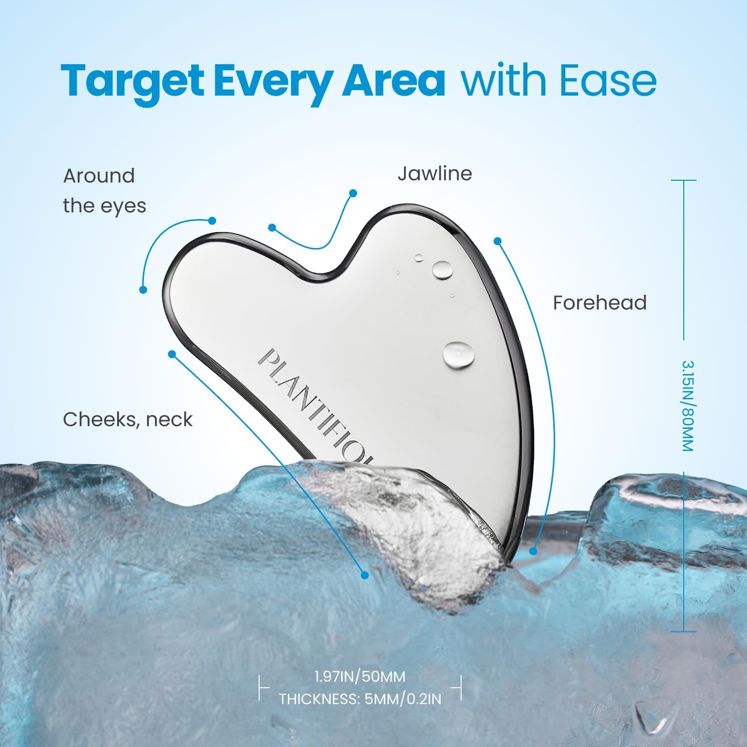 PLANTIFIQUE Facial Ice Roller and Stainless Steel Gua Sha Set - Cryotherapy Skin Care Massage Tools - Metal Massager Set for Puffy Face, Under Eyes and Body