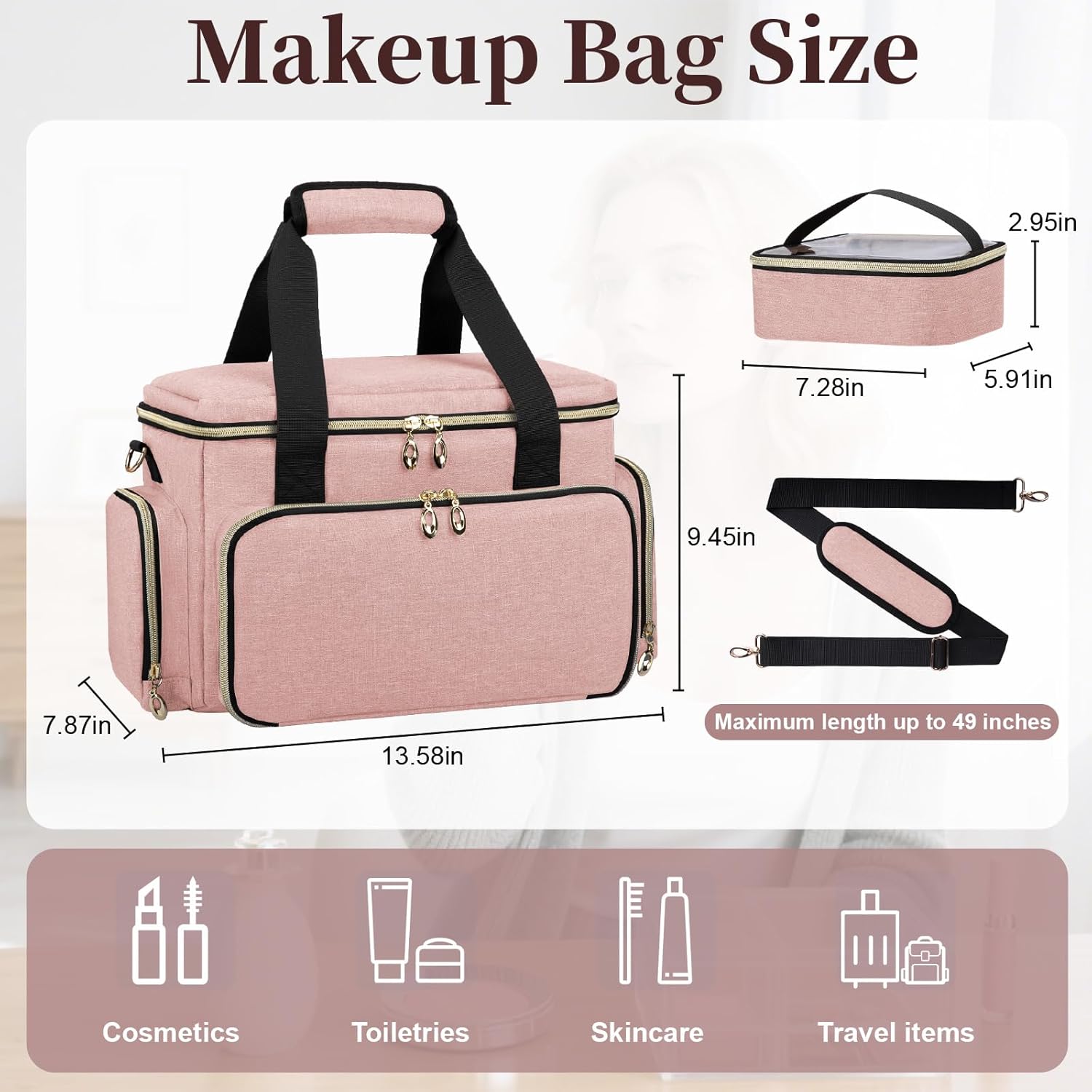 - Large Capacity Cosmetic Bag: 13.58" L * 7.87" W * and 9.45" H. This travel cosmetic bag is designed to be deep enough to hold bottles of cosmetics vertically. It can hold all your makeup palettes, lipstick sets, foundation, and other cosmetics and toiletries you need. Keep all your cosmetics neatly organized in your extra large toiletry bag